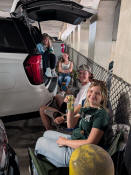 Sam, Teagan, Tyler, and Rose continuing the tailgate in the parking garage.