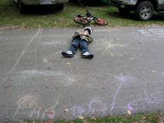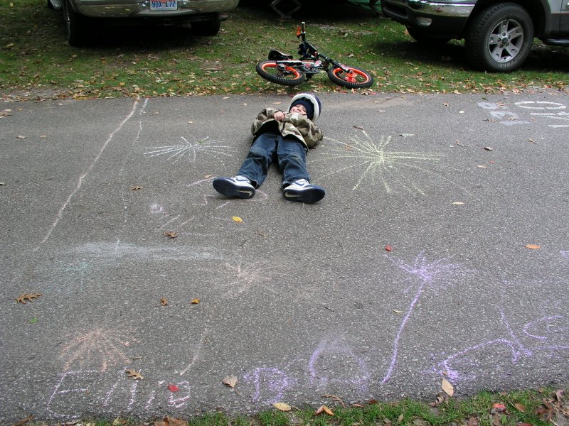 Tyler laying with his chalk fireworks. |
