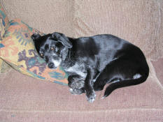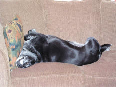 Another picture of Tahoe on the couch, this time laying on her back. |