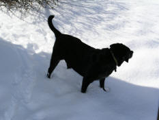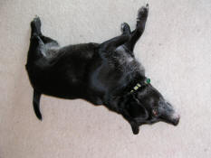 Tahoe eating a rawhide bone off of Rodney's back. |