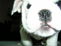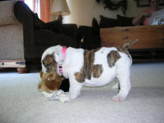 You can thank Jerry & Gail for this page. If they hadn't bought the excellent book "Marley & Me" by John Grogan (autographed, no less) before Tahoe passed and given it to Tara for her birthday, we wouldn't be in this situation so soon. Neither one of us thought that the book would affect us so much, but it really made us realize how much of an important part of our family Tahoe had really been. We also I decided that our house hasn't been the same since her passing in April. After a lot of searching and research, we finally found the dog of our dreams (well, my dreams anyway) in Tinkerbell. Although I preferred to name her Francis, I couldn't convince the kids to let me change it to that. Besides, with our family's Disney infatuation, Tinkerbell seemed like fate to us. Tinkerbell is an AKC English Bulldog. She was born on June 12th, and mere 6 days after Samantha's birthday. We picked her up on August 20th, and we hope she is a member of our family for a long time. |