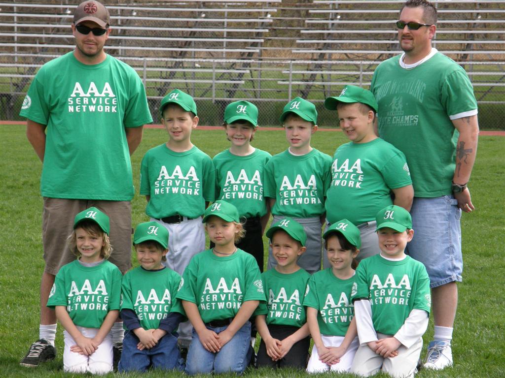 Sam's T-Ball team was first up. She wears #3 for the Dryer Funeral Home team. They have green uniforms. Tyler's Coach-Pitch team closely followed Sam's team. I wasn't quick enough with the camera (or his bat), so I only have one individual picture for him. Tyler wears #2 for the AAA Service Network team. His uniforms are also green (go figure!).