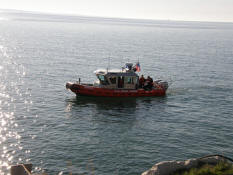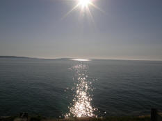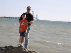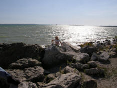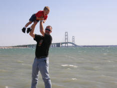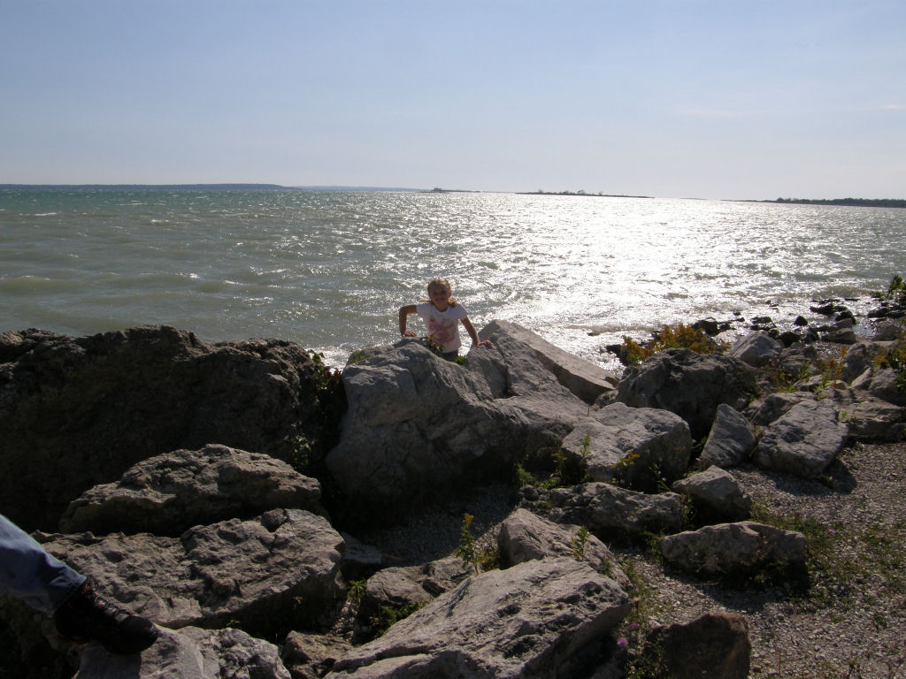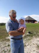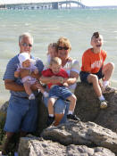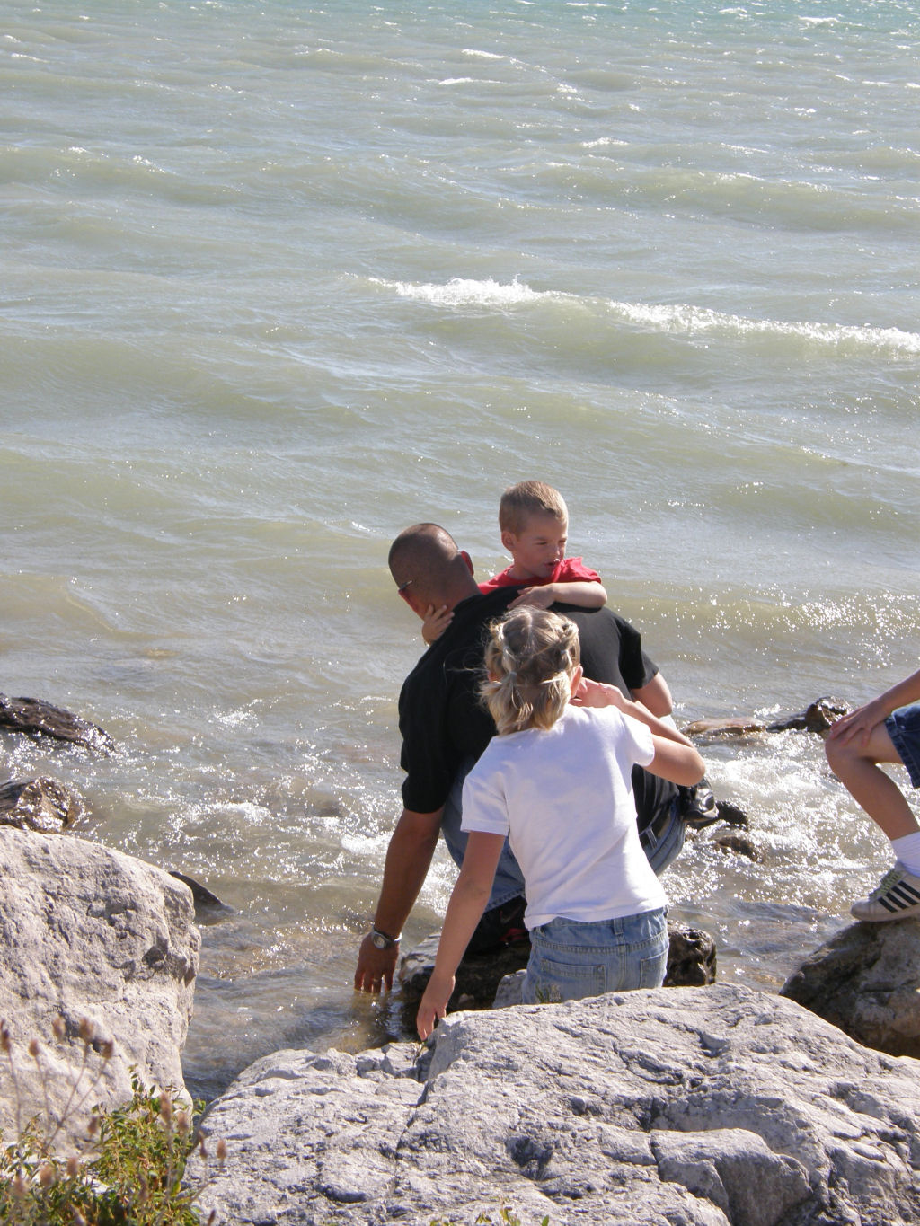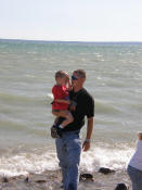 Rodney trying to get Drew to touch the water, while Sam looks on. |
