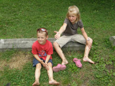Drew and Sam waiting to clean the mud off their legs. |