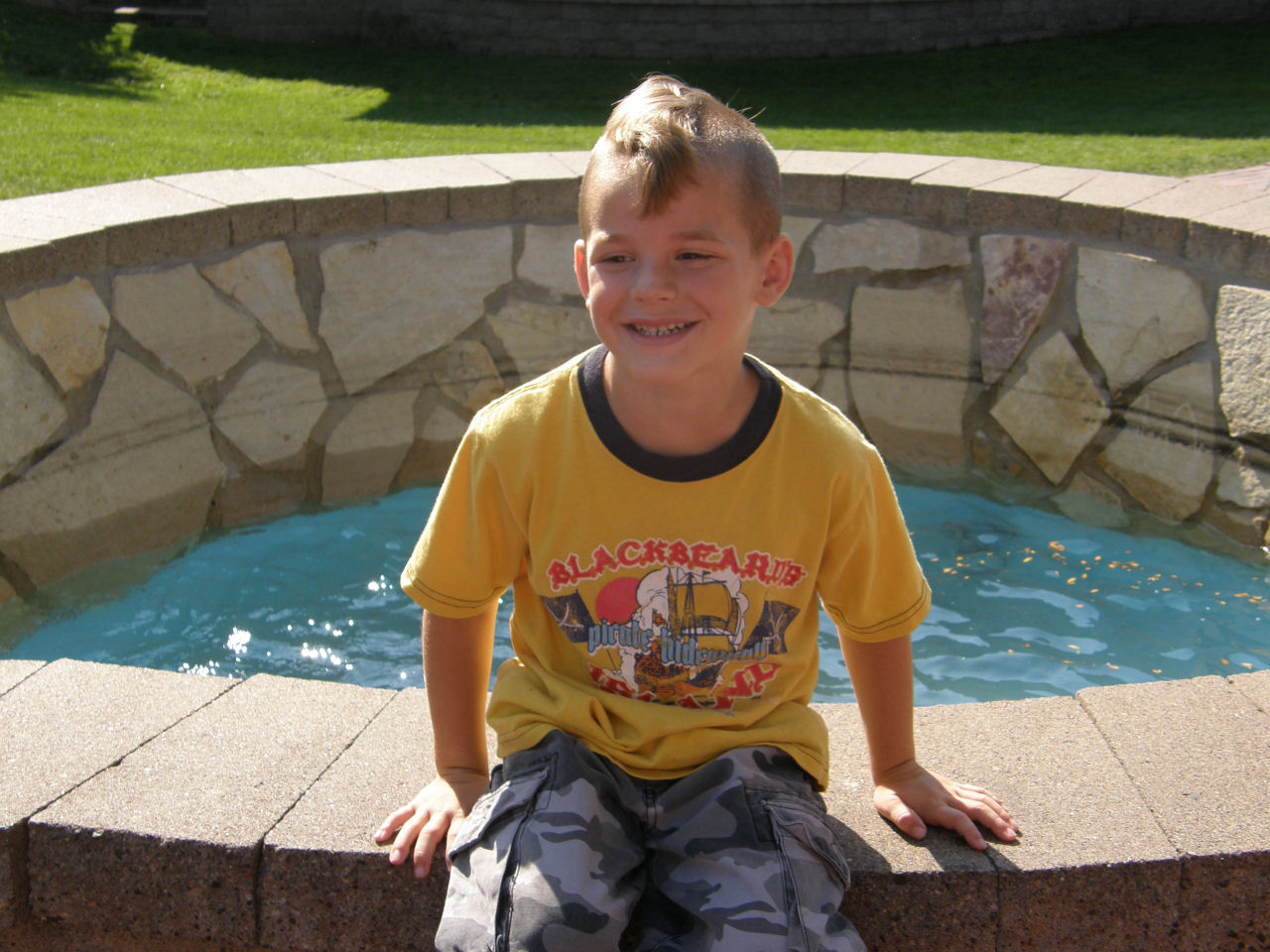 Jay, Drew, Sam, and Tyler playing in the water fountain inside