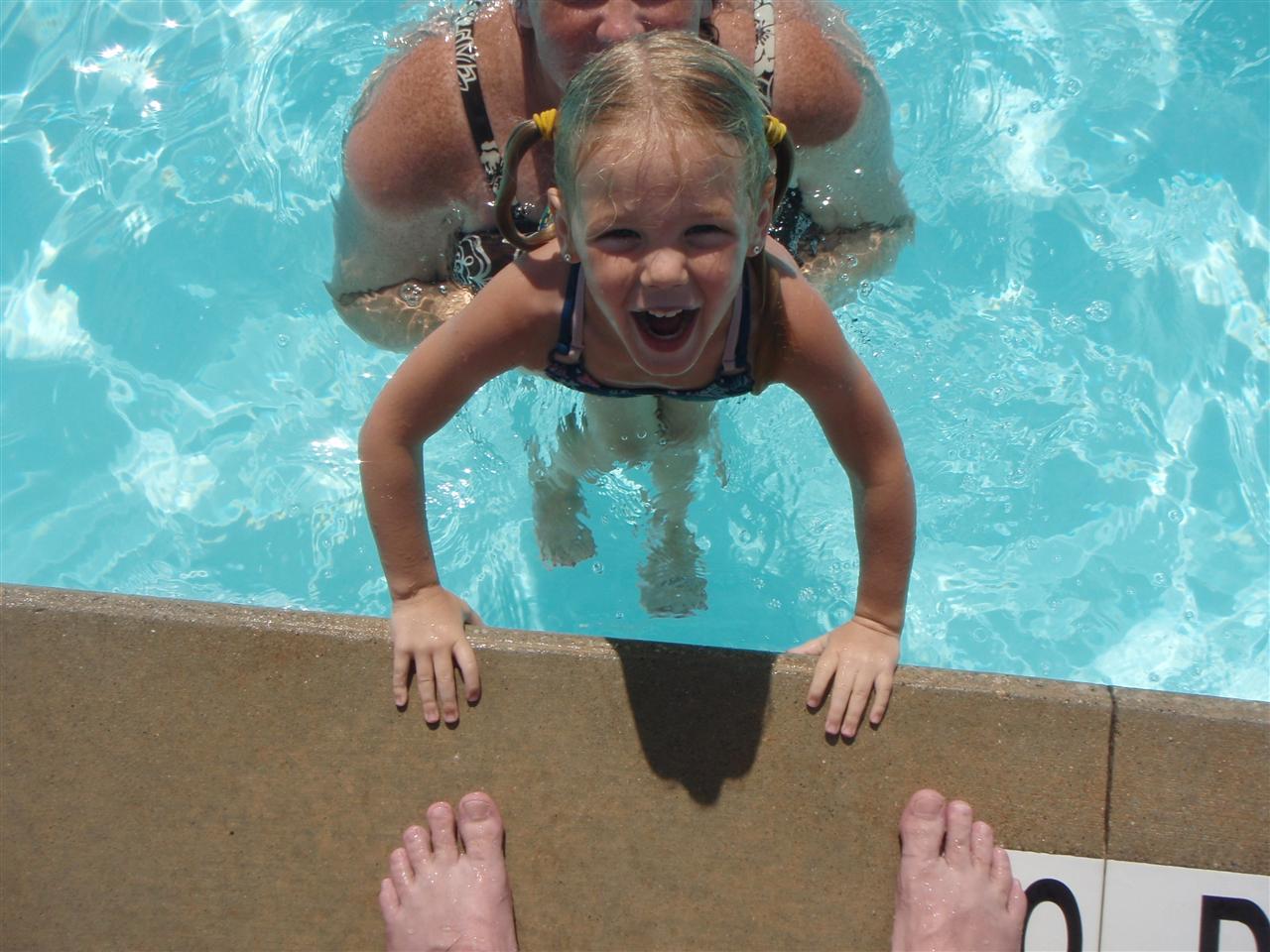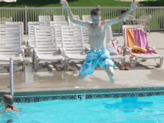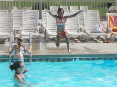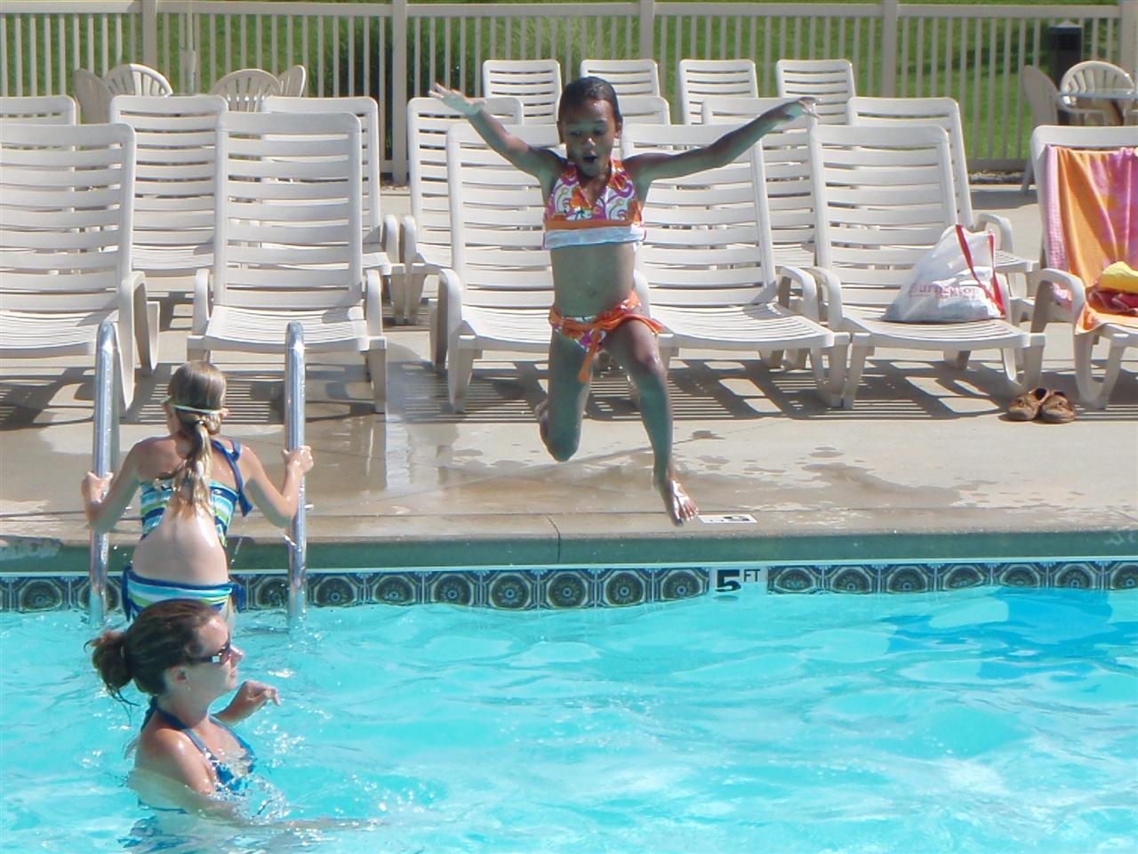 Samantha jumping in to the deep end of the pool.