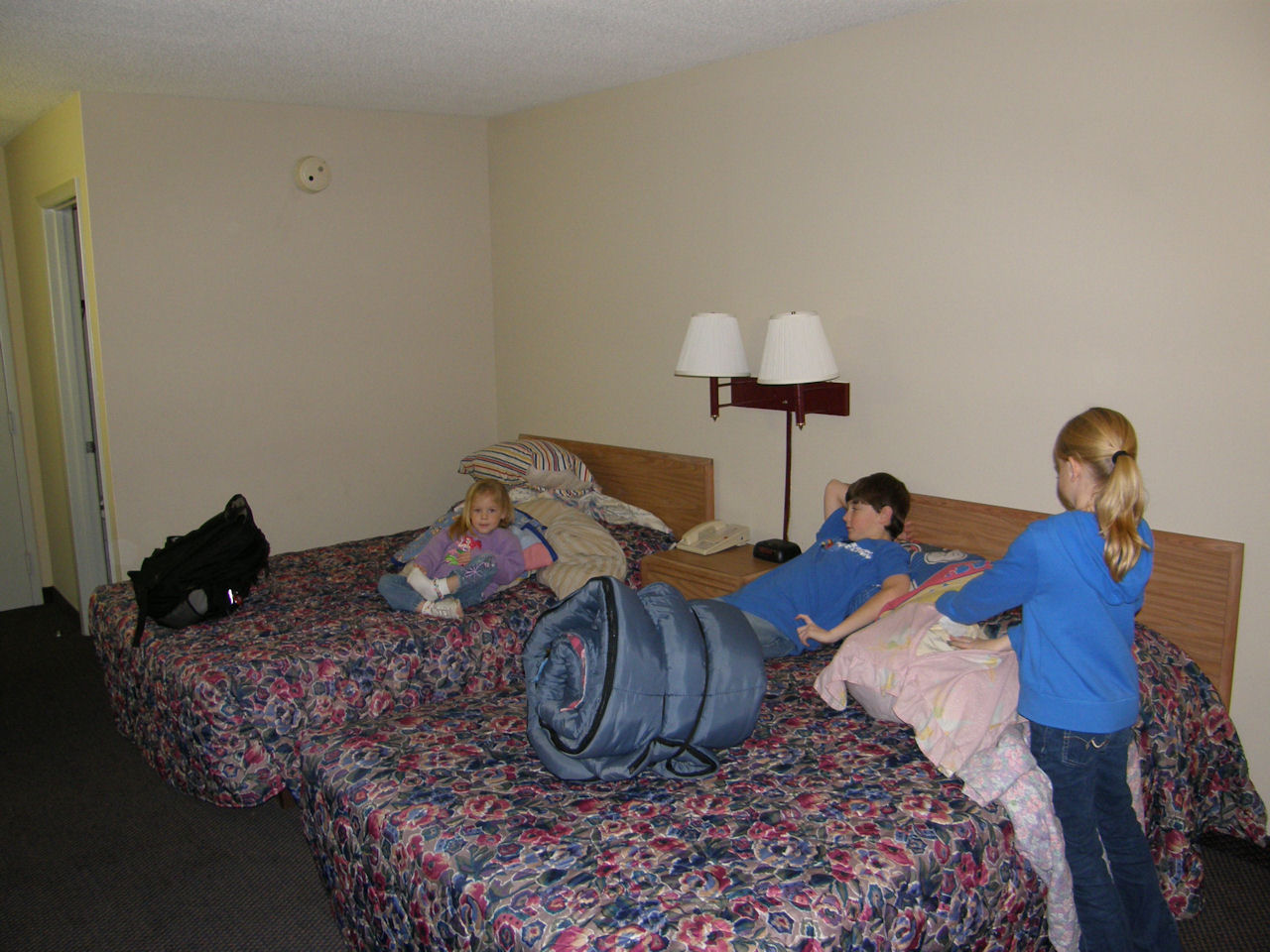 Jayden, Tyler, and Samantha checking out the beds in our hotel
