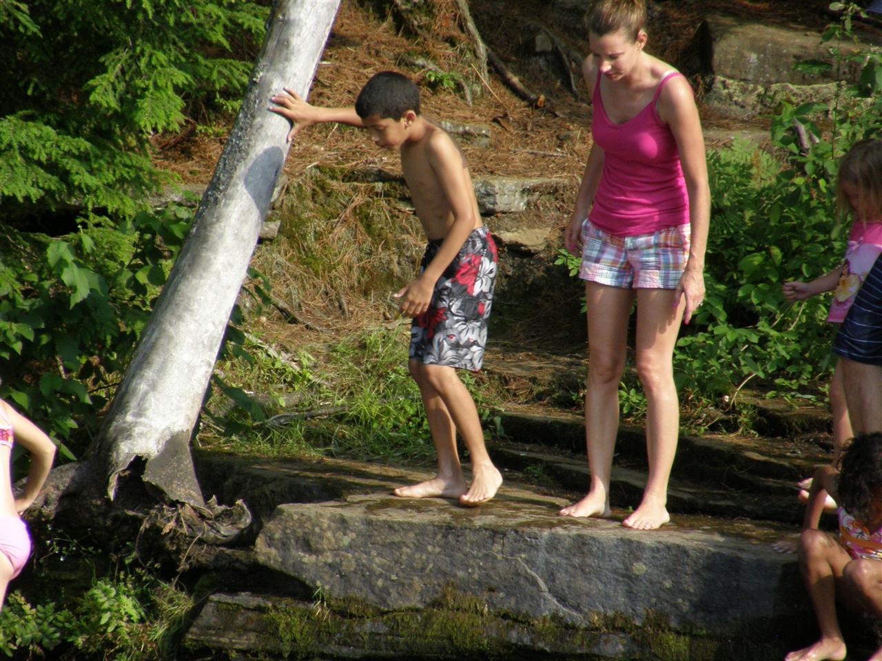 Rodney helping Jayden down the falls, with Tyler, Sam, Marissa,