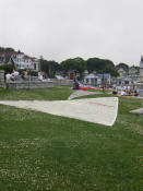 Some sails spread out on the lawn to dry.