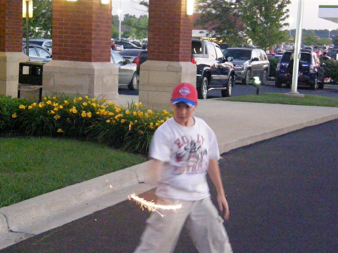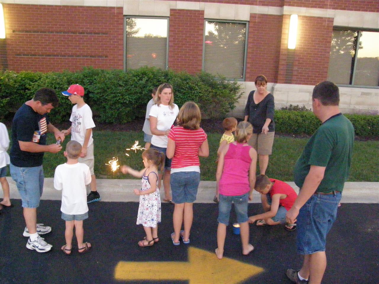 We met up with our friends from the parade once again later in the evening to enjoy the fireworks. Although the show was decent, the time we had to sit around protecting the location for our seats, when combined with the disaster that was the parking lot after the show, was just about enough to drive me nuts. Back to the beginning... we arrived at our spot, located on Silver Lake Parkway straight out from the Dunham's store. We had a nice spot, with about 20 folding chairs spread out to mark our territory. The kids passed the time playing various games of catch (football, baseball, and whatnot). They also had a lot of fun with those "Pop-Its" noisemakers. Shortly before the fireworks began we also broke out the sparklers. Trying to maintain sparklers for 11 kids was almost too much for our lone lighter and single candle. We decided it may be a good idea to arrive a little earlier next year, bringing a charcoal grill with us, and spending the time cooking out as many others had done. Once the fireworks show had ended it was time to make our way home. We didn't rush to get in the truck because we knew traffic would be bad, but even after we got in it was almost 30 minutes before we made any progress in the parking lot. We had actually parked in a bank parking lot that was attached to a larger parking lot for a strip mall. Most of that thirty minutes was spent still inside the bank parking lot! We finally got to the large lot, only to sit longer... I finally made the decision to hop a curb and make my way to another line. Unfortunately that line wasn't moving any quicker, so a u-turn resulted in a drive to the opposite end of the lot and finally success on the road home. All in all, a 30 minute (give or take) fireworks show took up almost 5 hours of our time... For the most part it was worth it, though. Until next year!