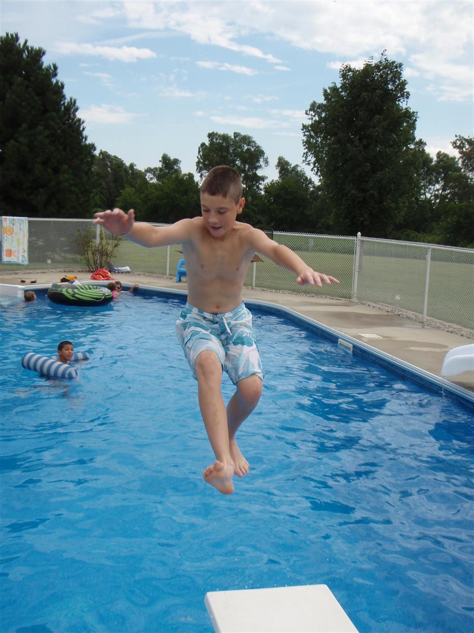 Tyler and Jayden watches as Dozer the dog jumps into the pool.