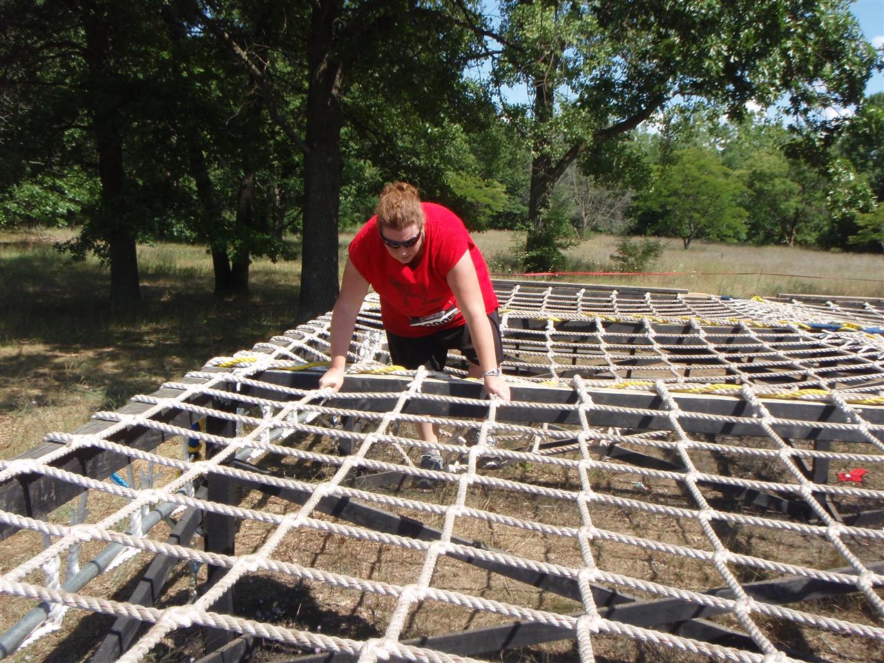 much as it sounds. Climb high up a near vertical cargo net, over the
