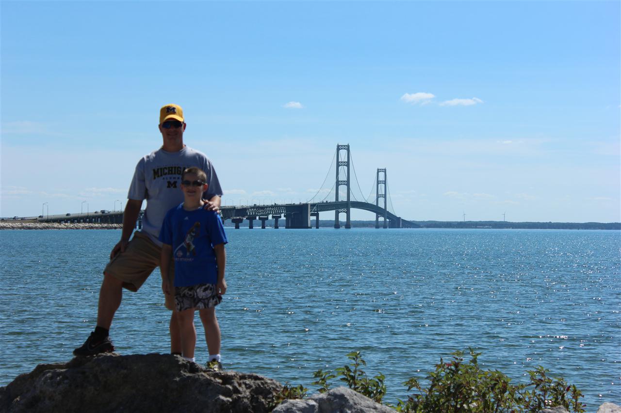 Rodney standing with Drew in front of the Mackinac Bridge.