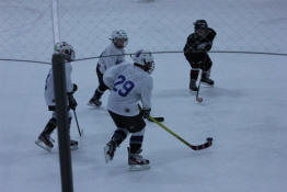 Drew and his teammates converging on the puck.