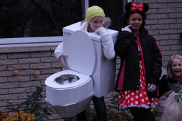 wanted to go as a toilet, so I custom built her a commode out of cardboard. Drew