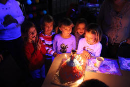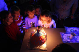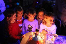 Jayden blowing out the candles as her friends look on.