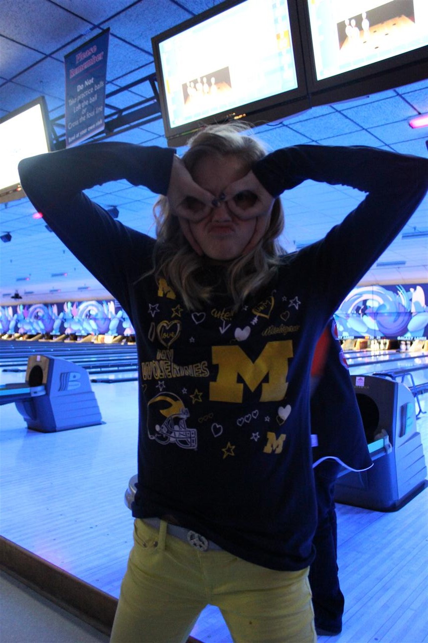 Sam watching as her ball rolls down the lane.