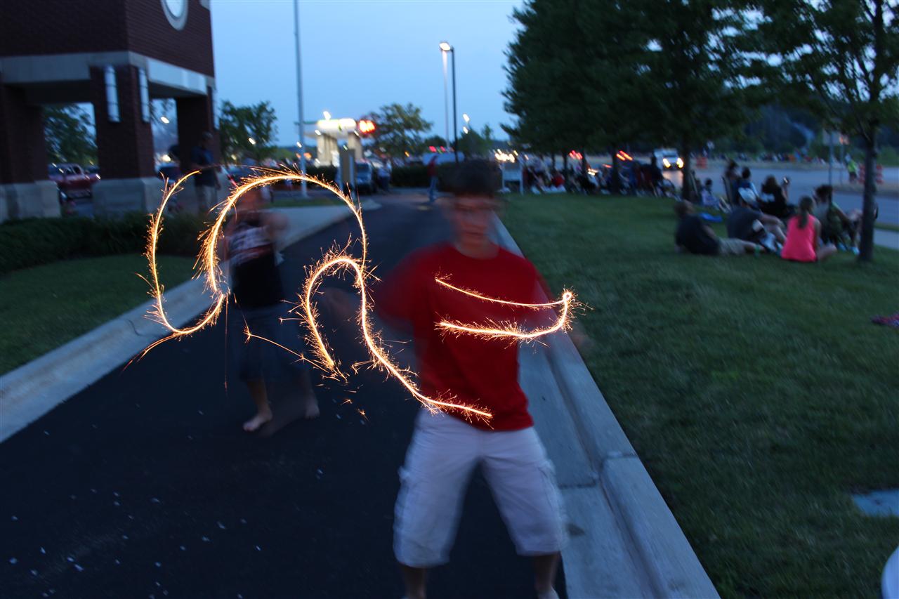 After a long day of parade watching and dinner at my parents house, Tara & I headed off to Fenton with Tyler, Samantha, Drew, and Jayden to stake out a spot to watch the Freedom Festival Fireworks. Thad & Melissa, along with their kids Hannah, Taren, and Tevin, were right behind us. We settled down in front of an empty bank building (in the same spot we had last year) and set up our tent and chairs. The kids were begging from the get-go to do sparklers and those "Pop-It" noise makers, but we somehow managed to hold them off for a while. The next of our party to arrive was Beth with her children Adam and Jessica (and another daughter whose name escapes me that I met for the first time tonight). Beth brought popsicles for all of the kids to enjoy, and once they were gone it was time for the noise makers. Despite our attempts to get them to not throw them at each other, Tyler managed to learn why they were called noise makers when he took one in the ear. He was genuinely concerned that he may have lost hearing in one ear, but neither Tara or I had any sympathy for him. When it gradually started to come back he was extremely relieved. We had two more additions to the party at this time. First to arrive was my Dad & Mom, along with Uncle Steve. Next was Dwayne & Erica with Donovan and Marissa. With everyone here it was time to break out the sparklers - including the extra long ones that Tara found at a fireworks stand! The kids had a blast with all of the sparklers, and nobody even got burnt! I'd call that a success! Finally it was time for the show to begin. We settled into our chairs and on blankets in the grass to watch the fireworks show unfold in front of us. I think most of those who attended the Groveland show with us deemed that one to be the better experience, although this was enjoyable too. Of course getting out of the parking lot after the show ended proved to be difficult, despite us not actually parking in the bank parking lot this year. Aside from that snafu, it was a great evening with good friends. I still want to just arrive a little earlier next year and cook out... bring a grill, some dogs and burgers, and make a tailgate event out of it!