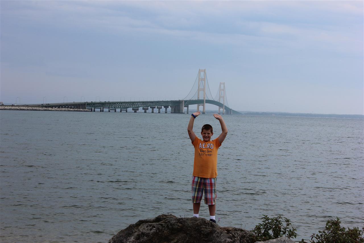 Jayden getting a chance to hold up the Mackinac Bridge.