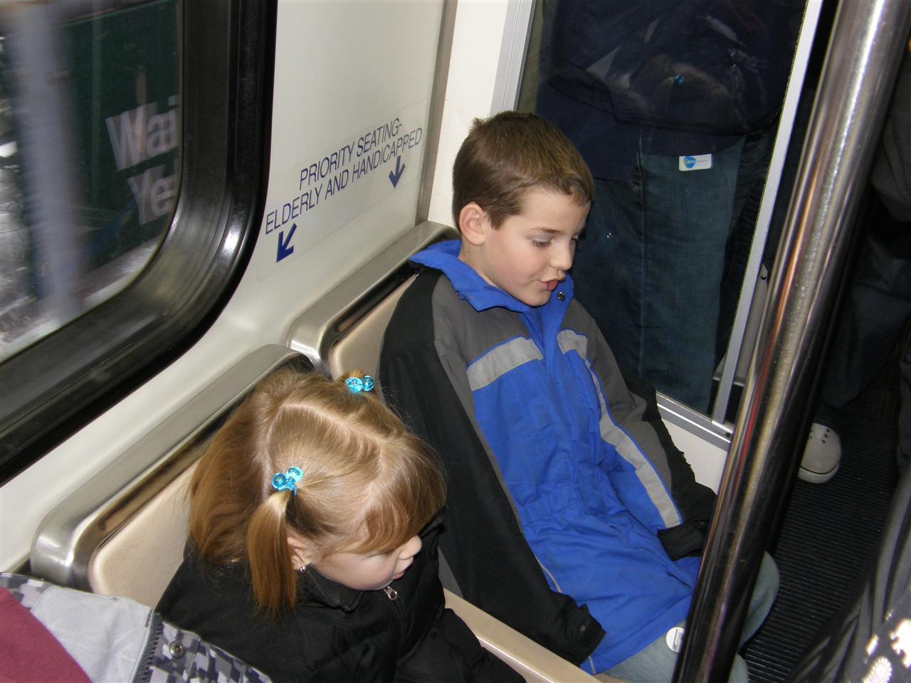Drew, Tara, and Sam sitting on the people mover. Does this photo