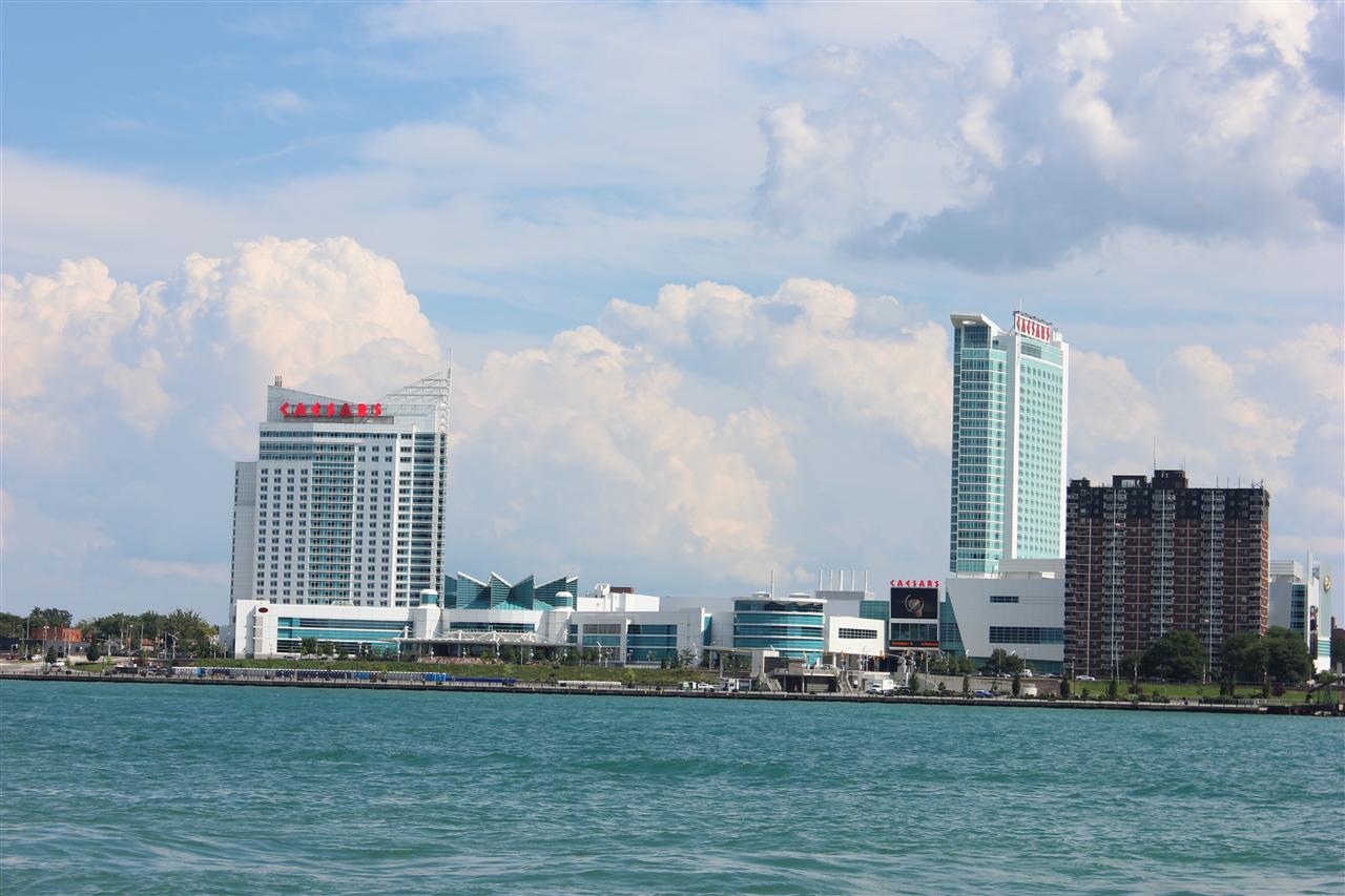 in the background, with the Detroit Princess riverboat in the