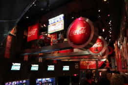 A giant light-up Coca-Cola sign visible from the street.