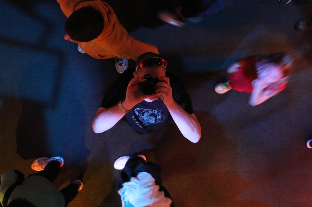 Rodney taking a picture of himself in an overhead mirror.