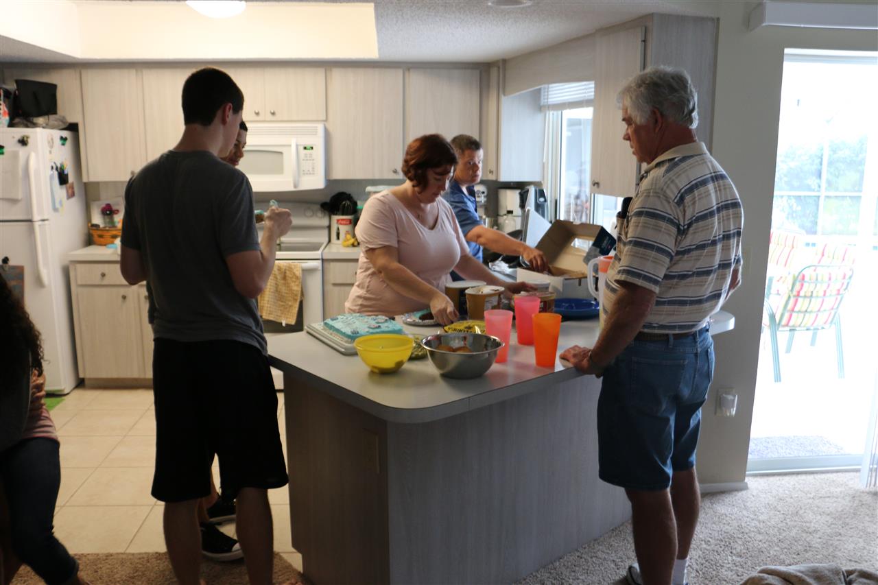 The family getting ready to enjoy some cake and ice cream.