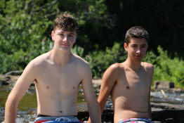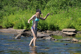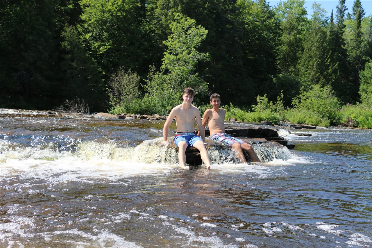 Sam sitting on a rock ledge with the waterfall flowing nearby.