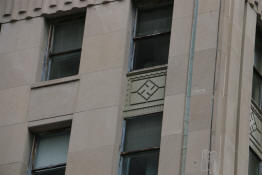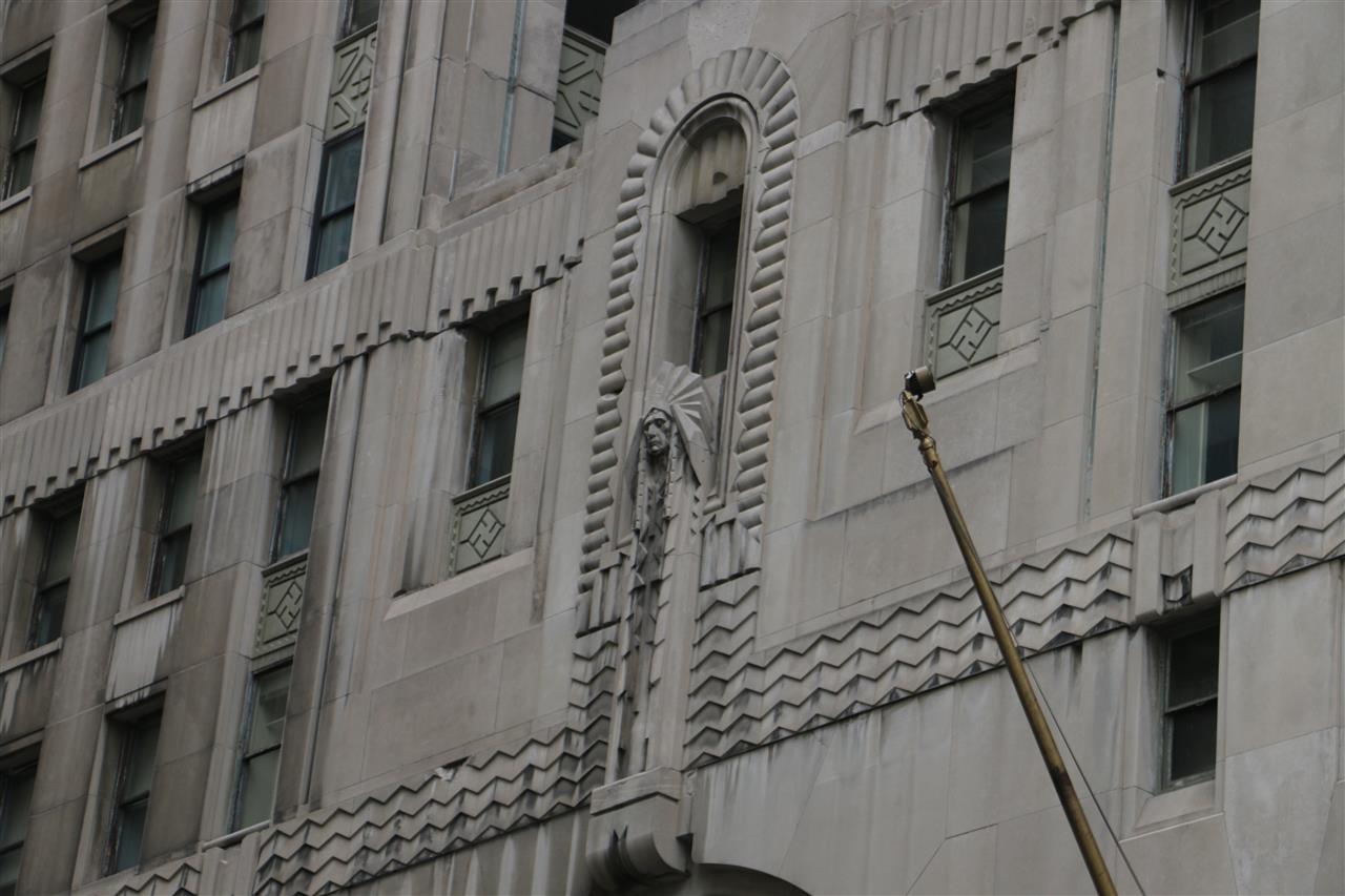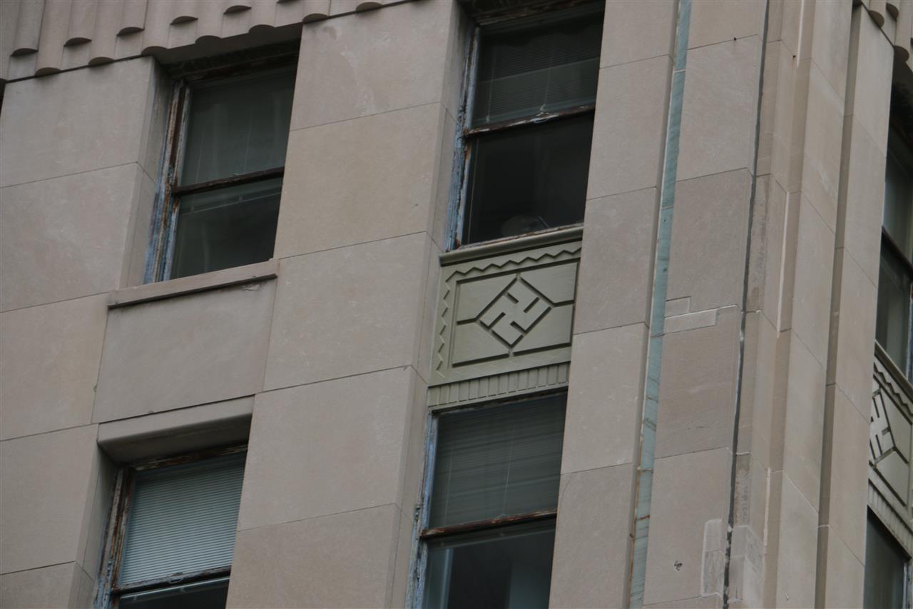 the building is Native American, hence the swastikas, chief's head,