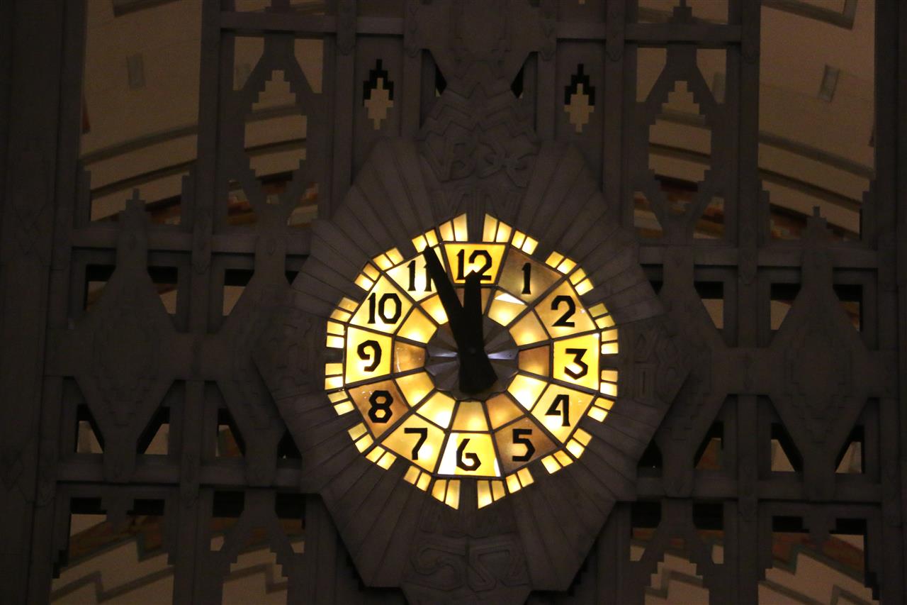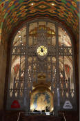 A close-up look at the Tiffany clock in the lobby.