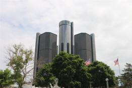 The GM Renaissance Center as seen from Hart Plaza.