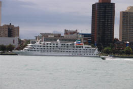 A cruise ship docked across the Detroit River in Windsor,