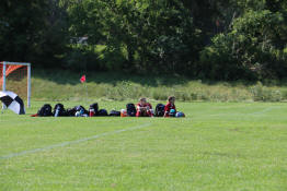 Jayden and a teammate sitting on the sideline while waiting to