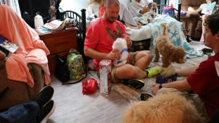 Dwayne holding Teddy while checking out his gift from Grandpa Gary