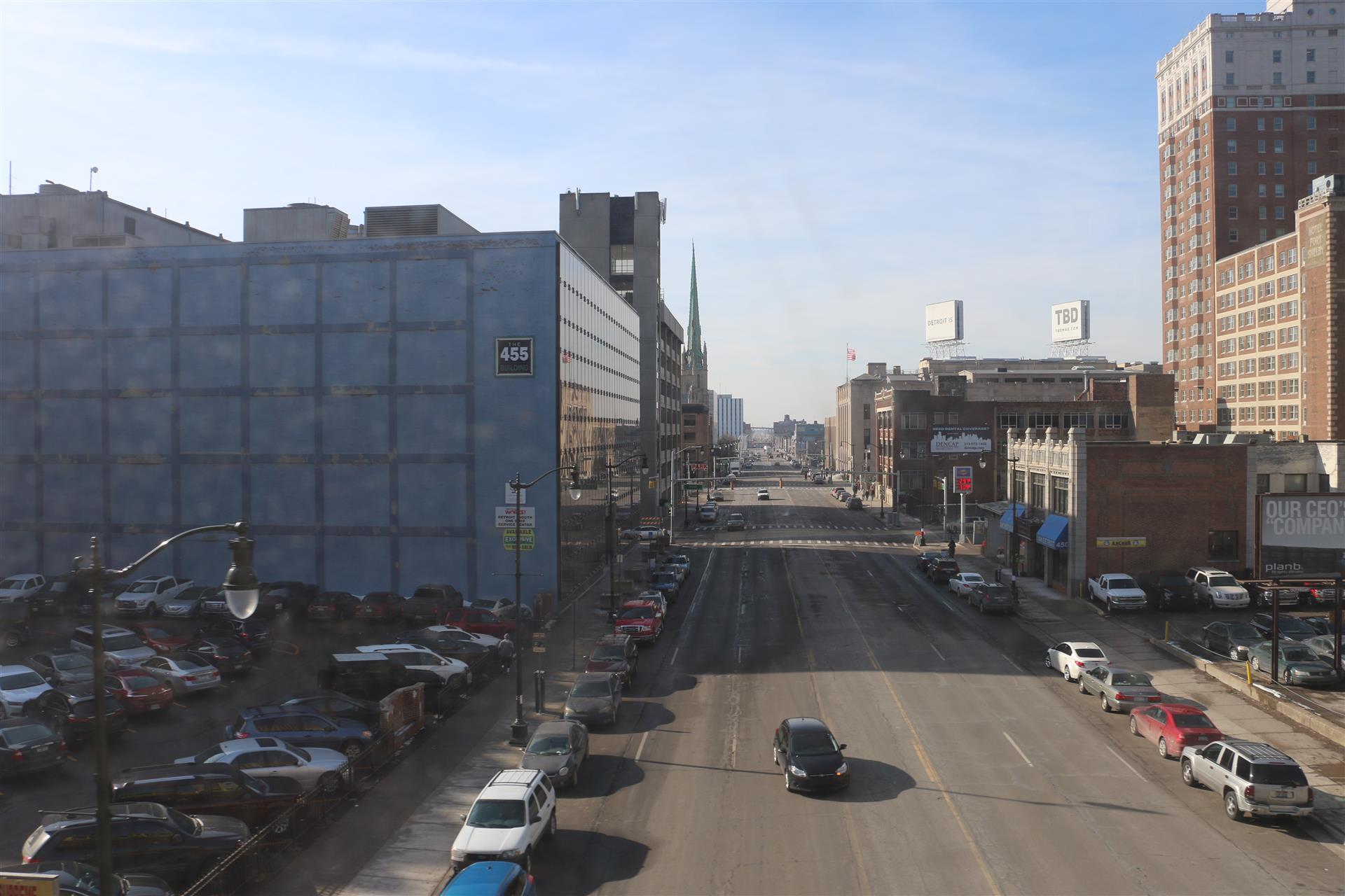 A look down a Detroit street from high above ground in the