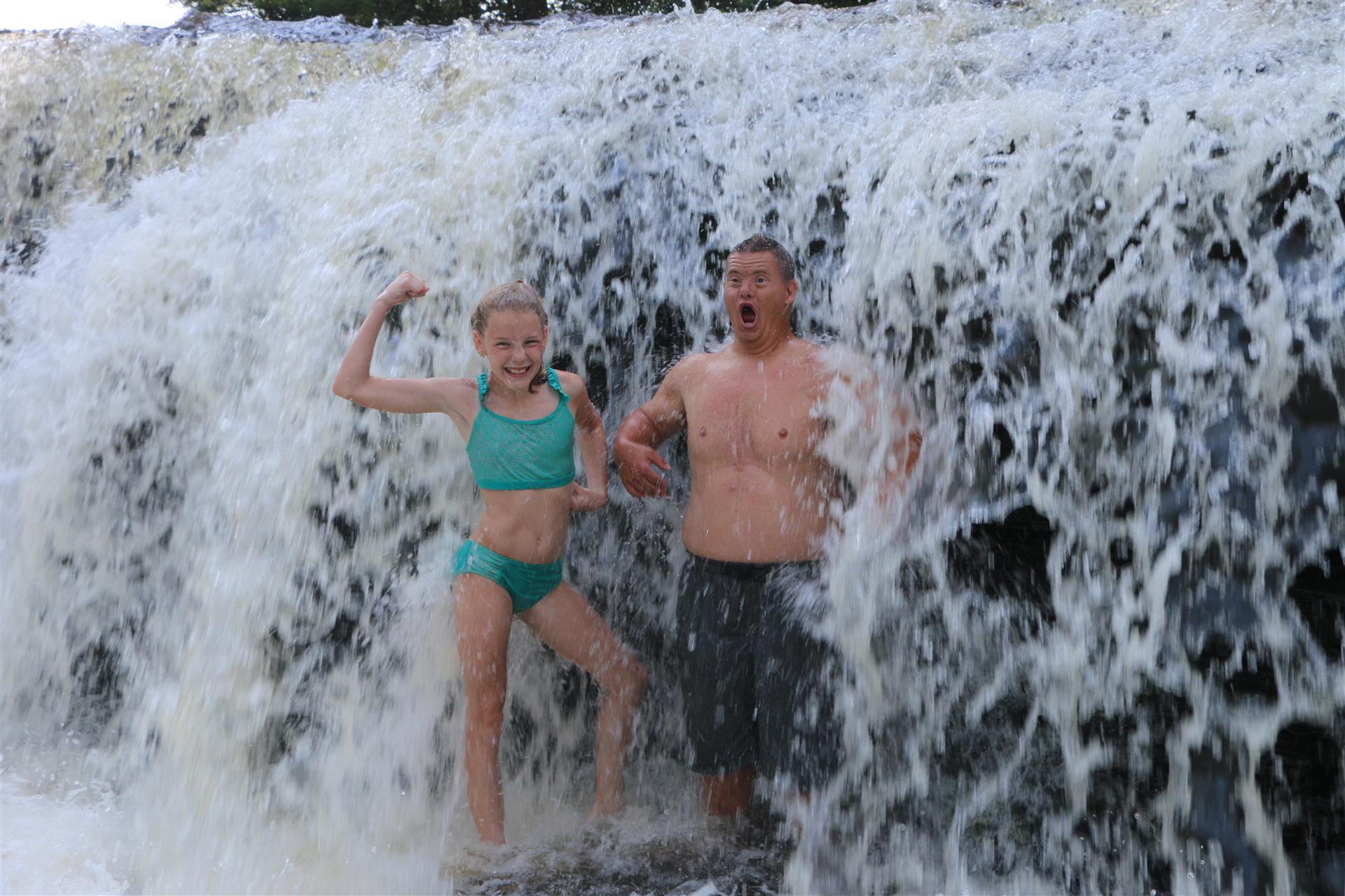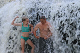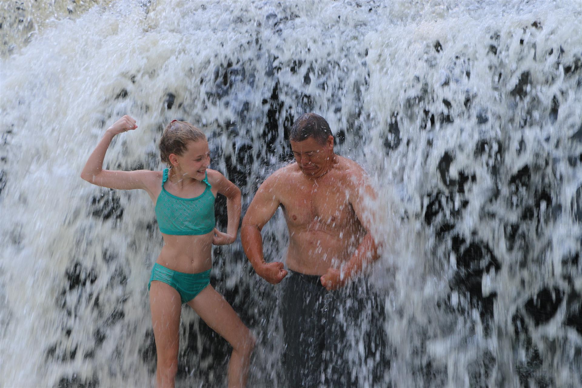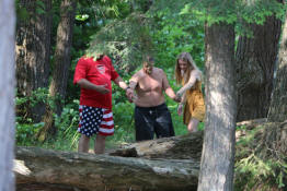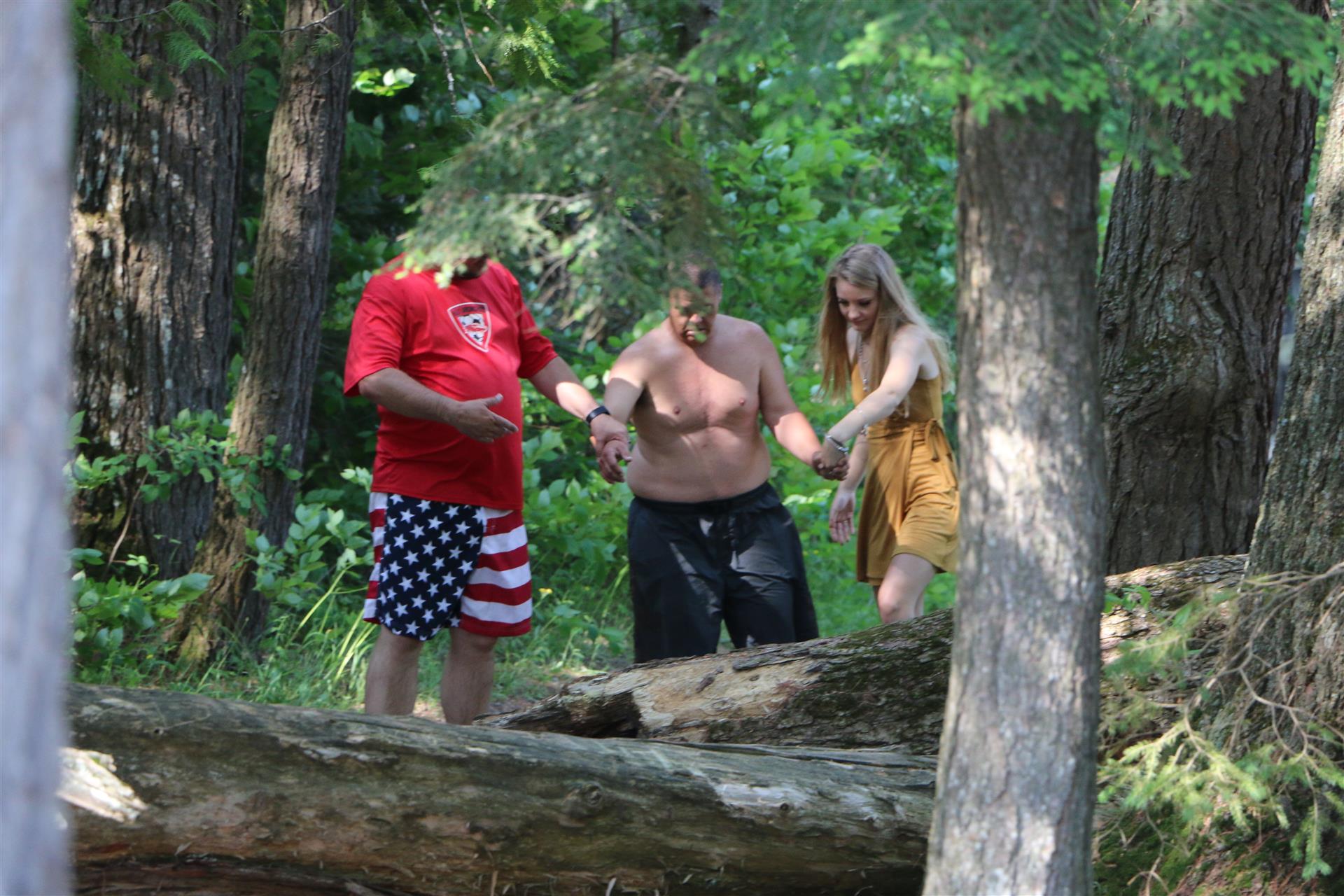 Rodney and Samantha helping Uncle Steve walk along the trail