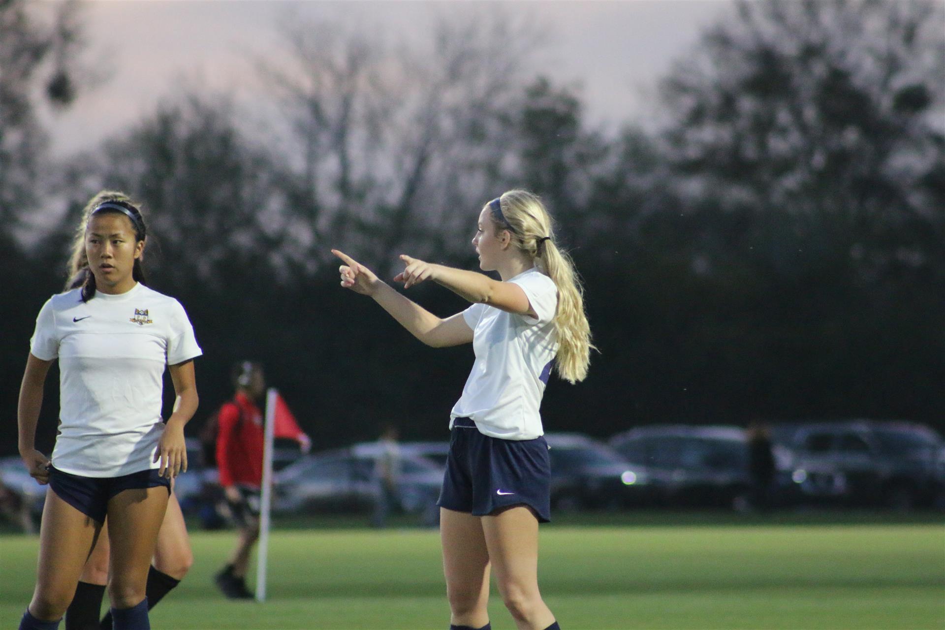 Sam talking to her teammates on the field.