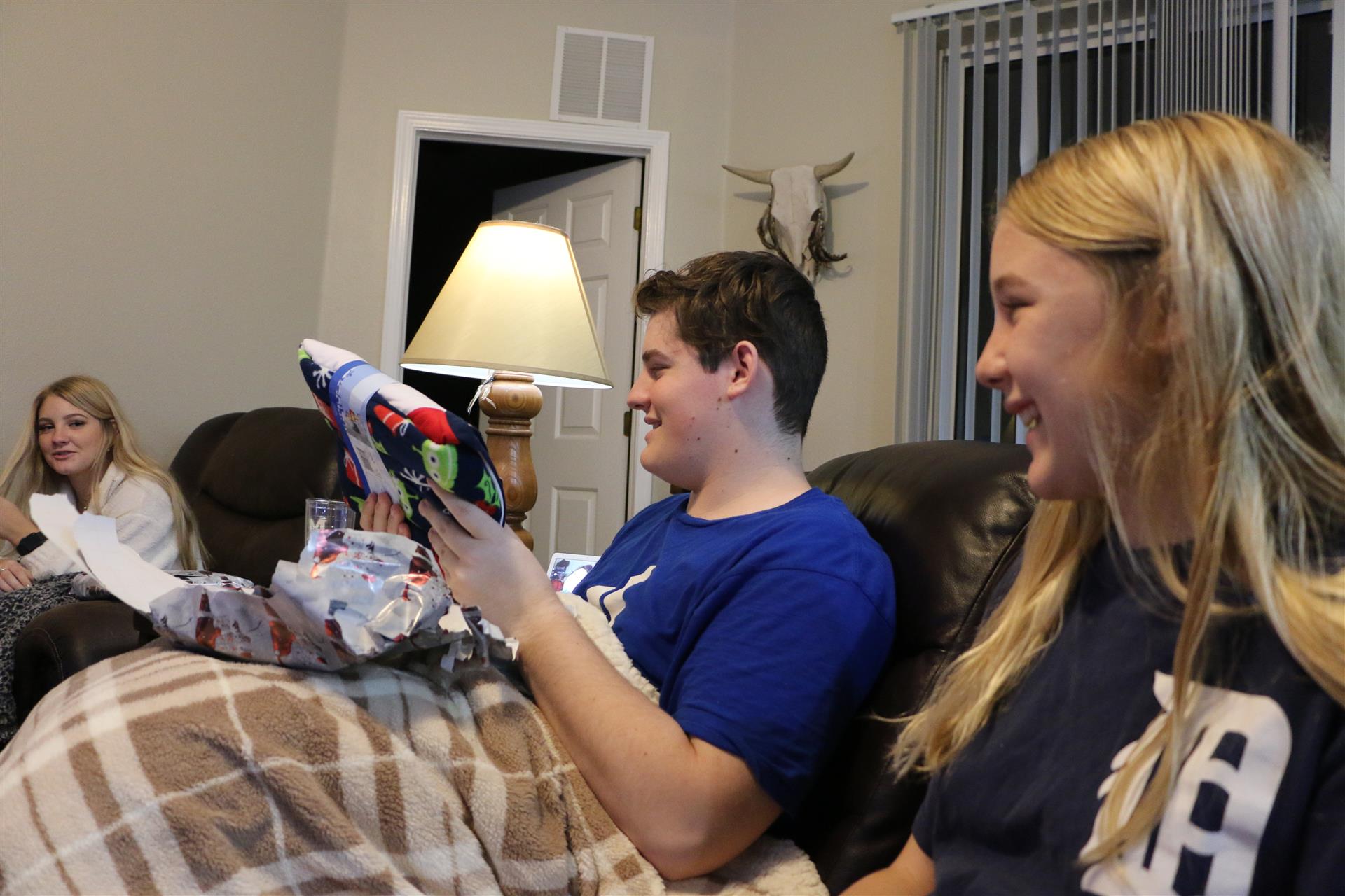 Tyler looking on as Drew reads his card from Grandpa Jerry &