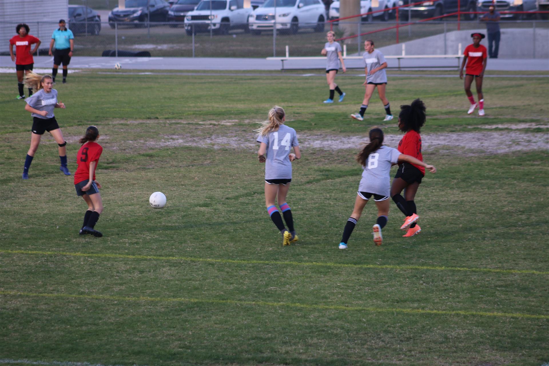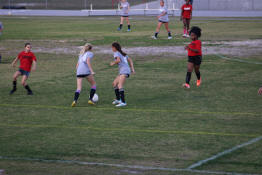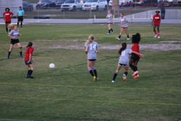 Jayden trying to beat two Eisenhower players to the ball.