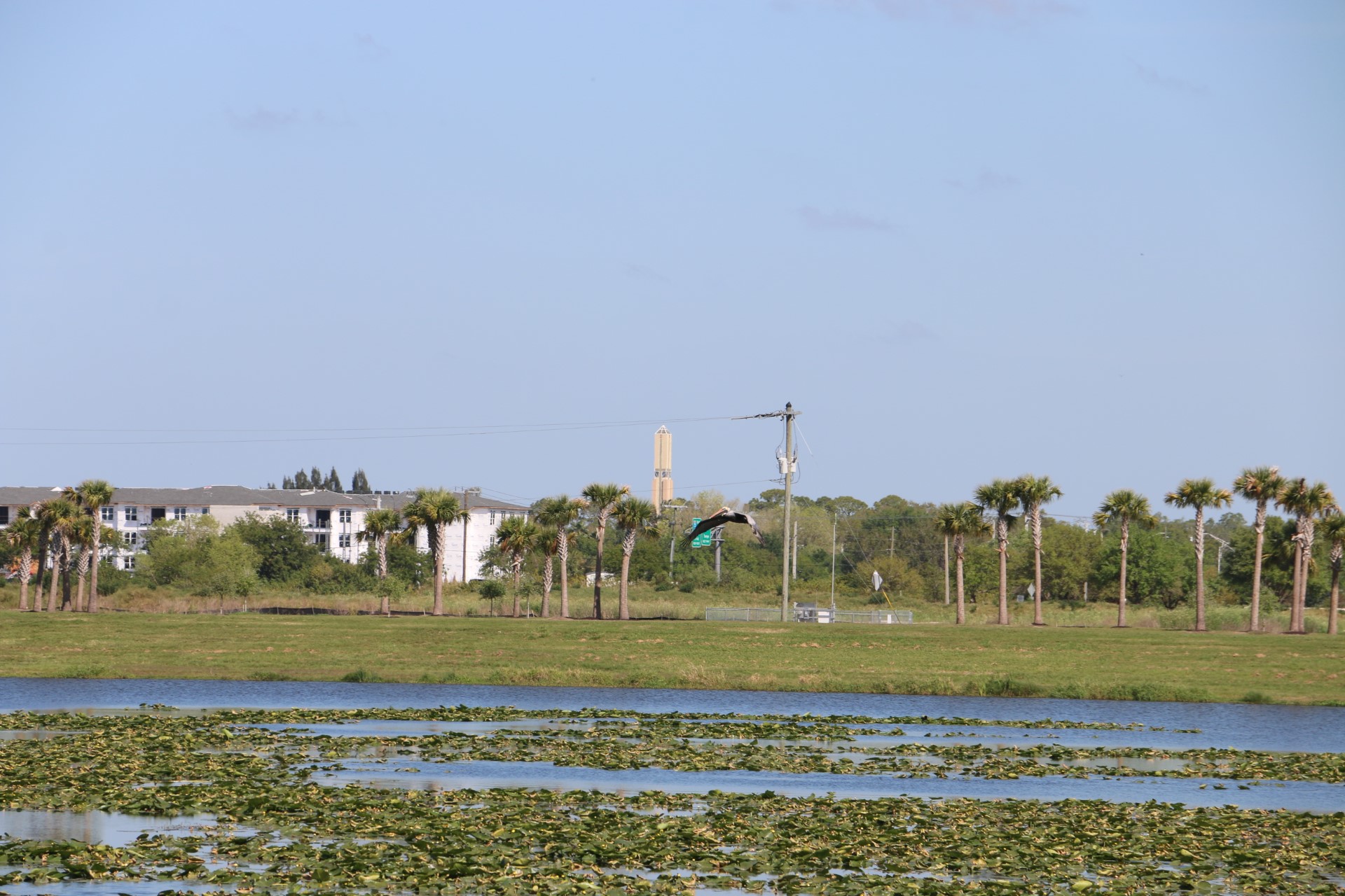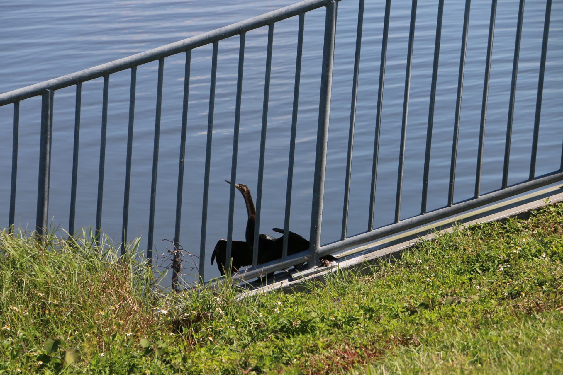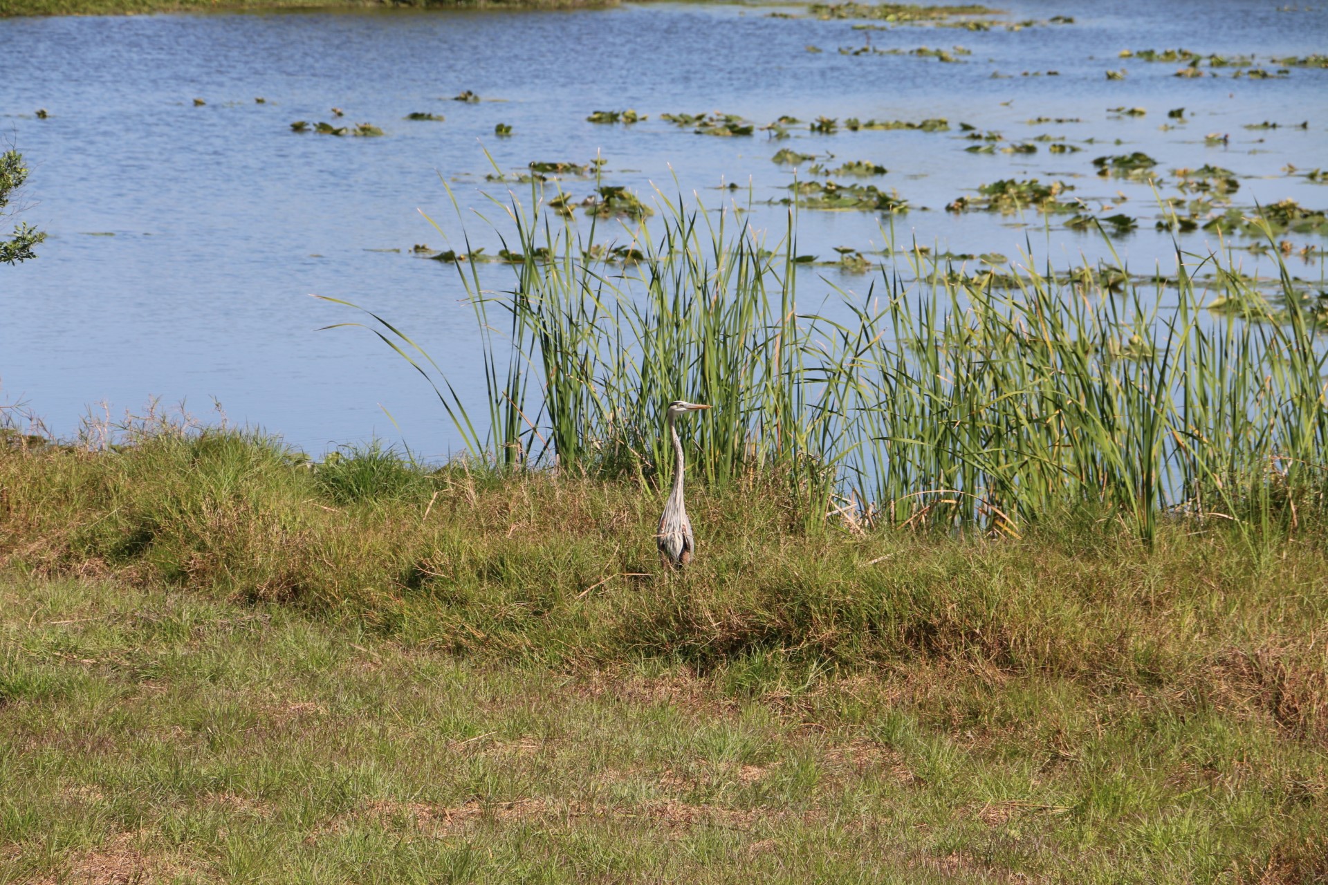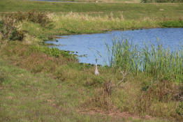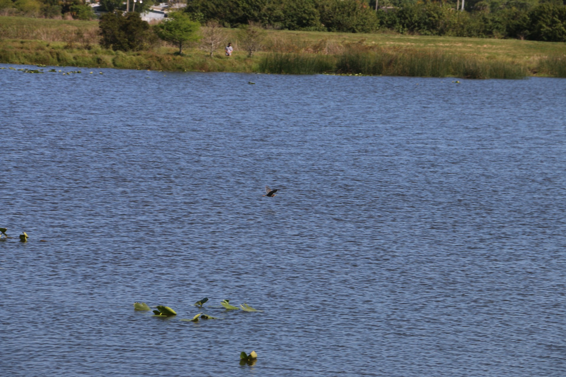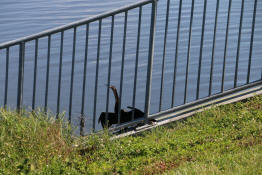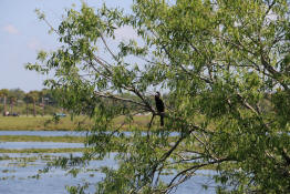 An Anhinga bird sitting in a tree near the edge of the pond.