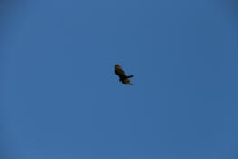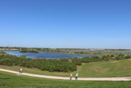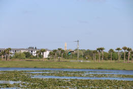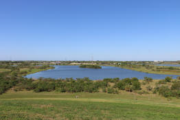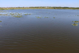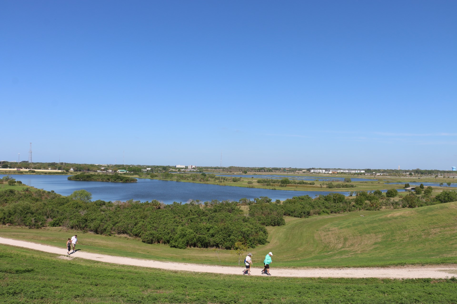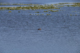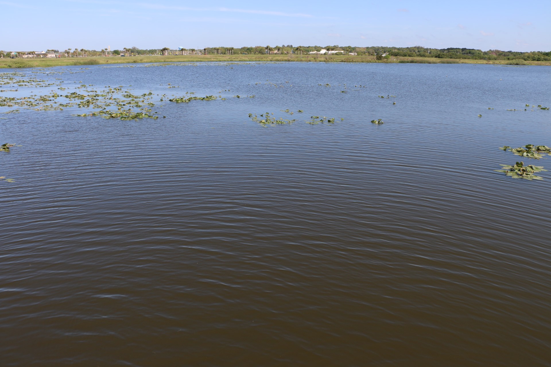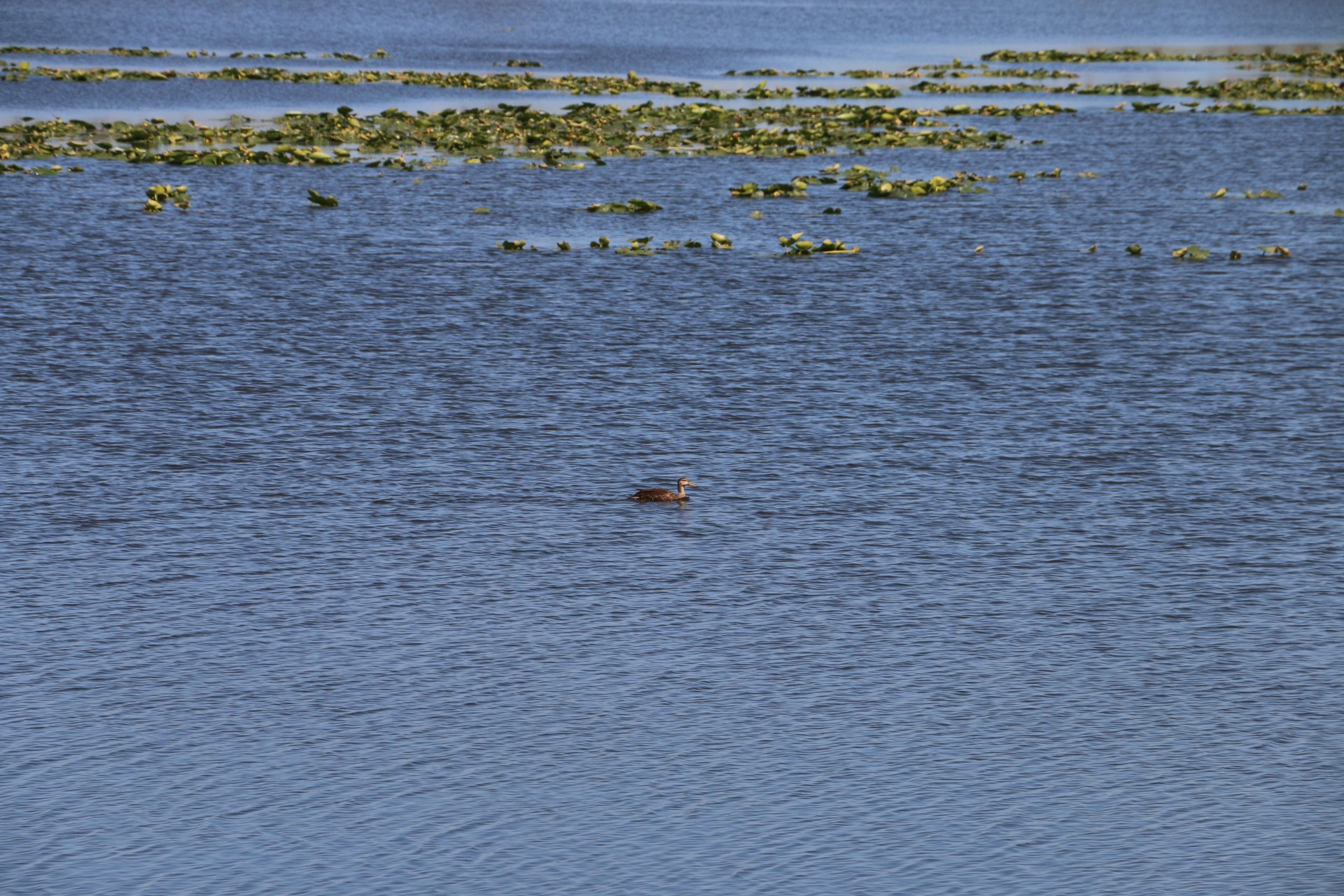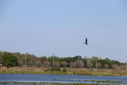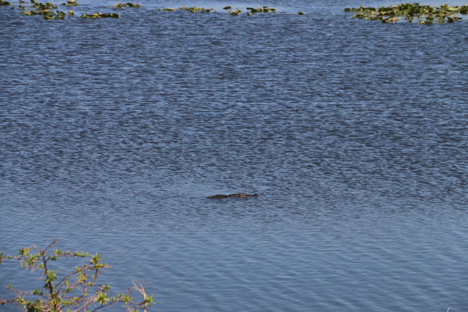 An Anhinga bird sitting in a tree near the edge of the pond.