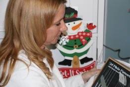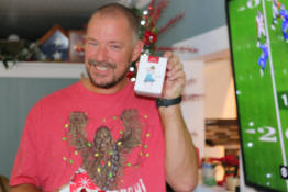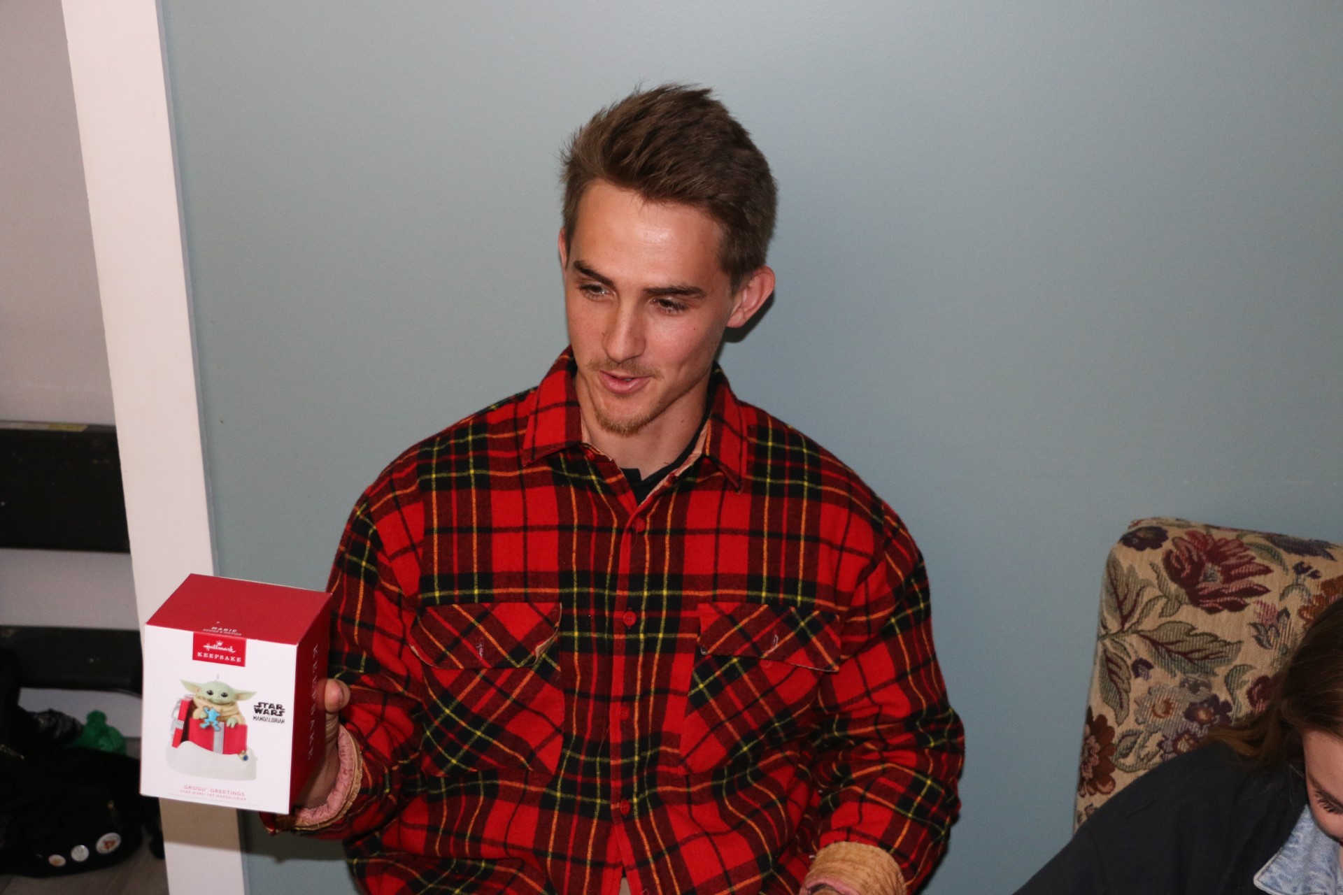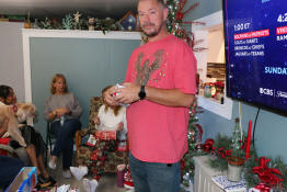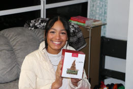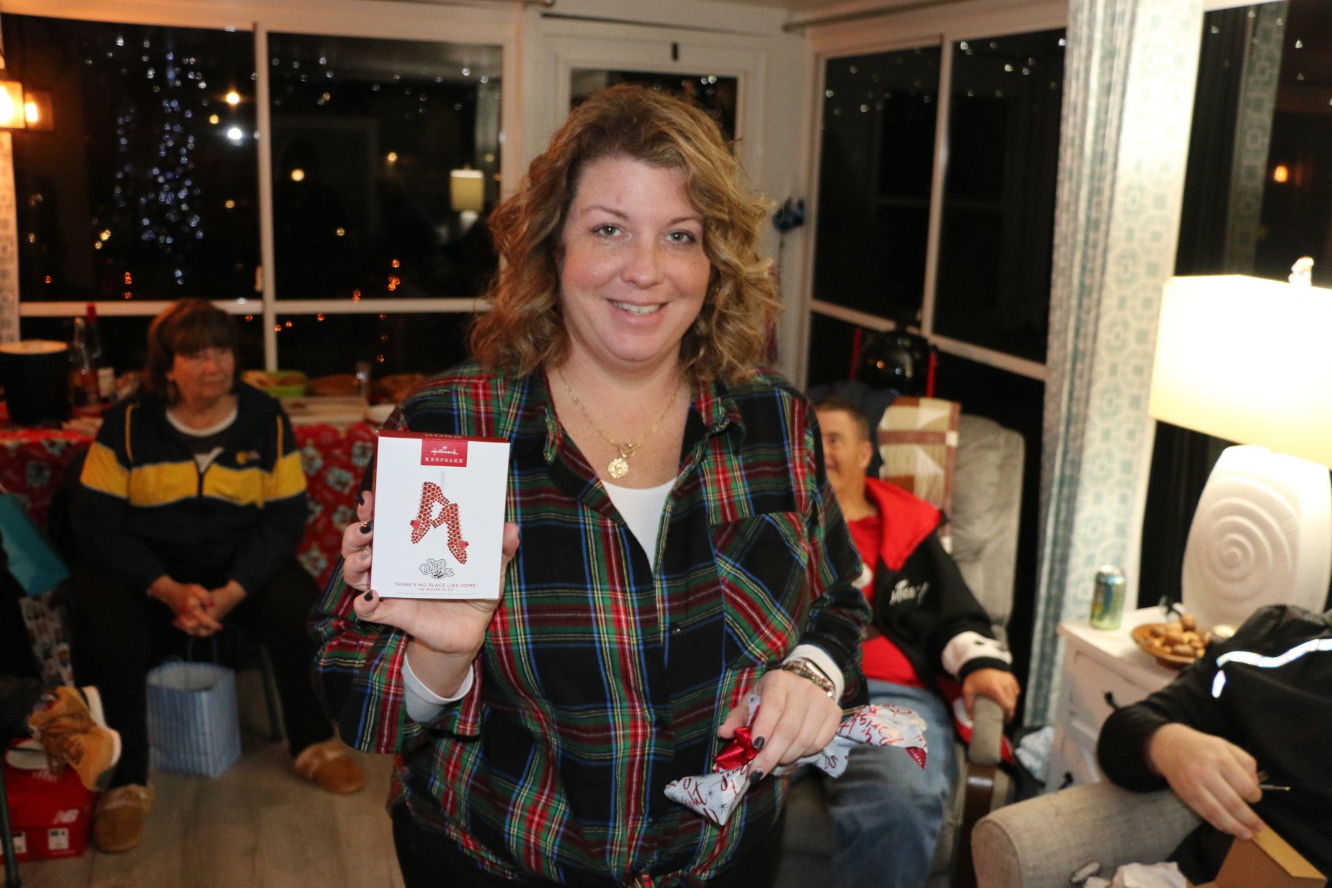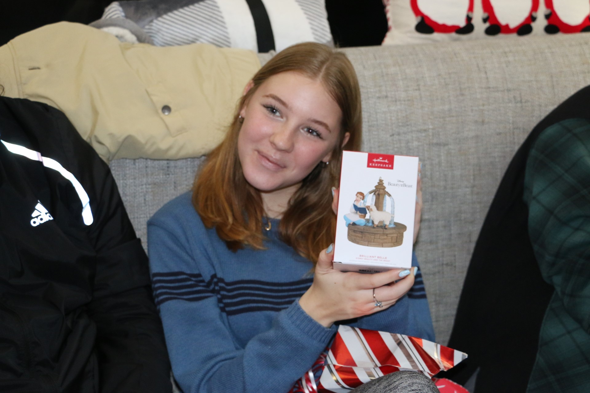 Jay showing off Beauty and the Beast ornament that she recieved.