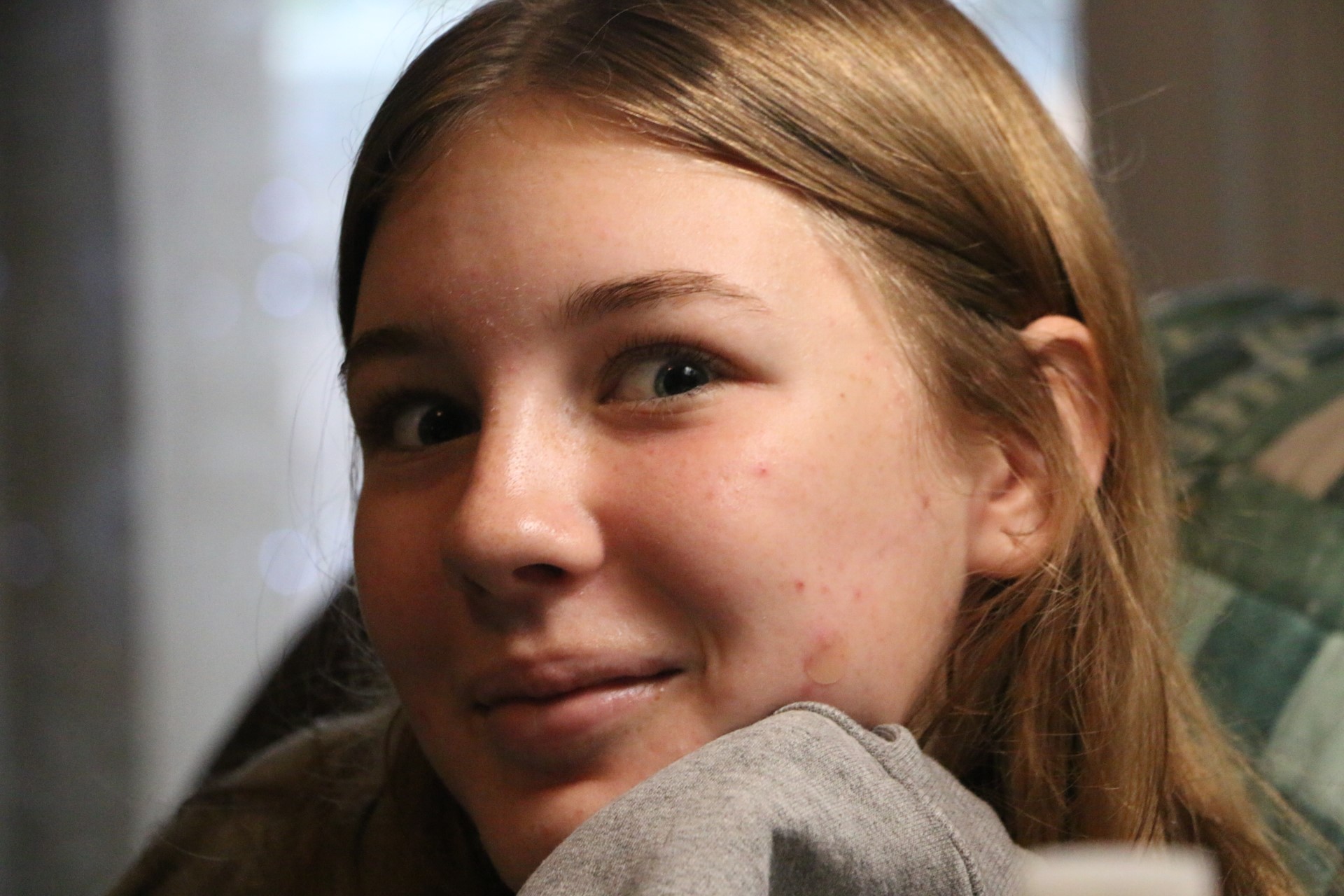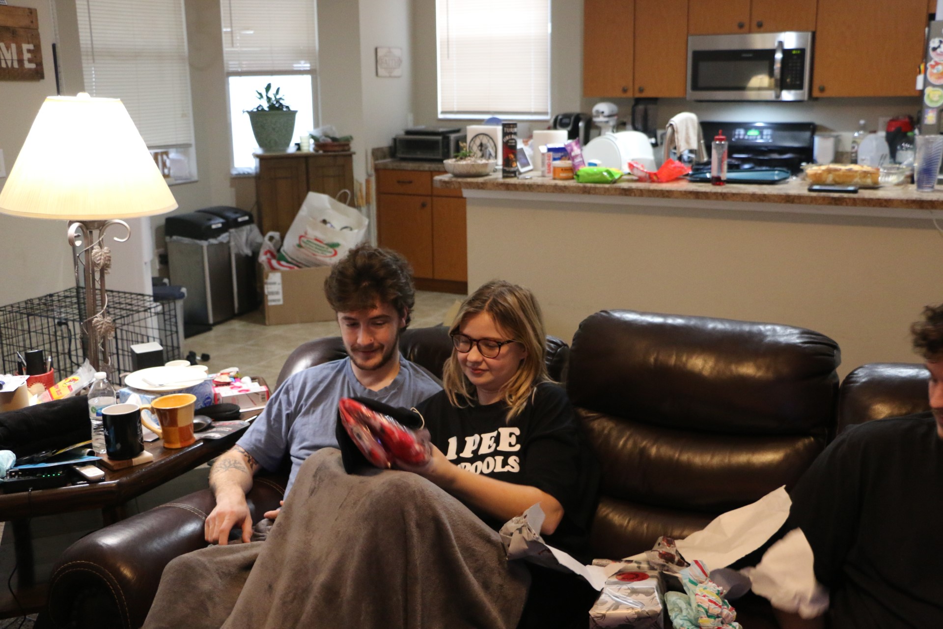 Jayden and Drew looking on as Tyler and Rose open their cards