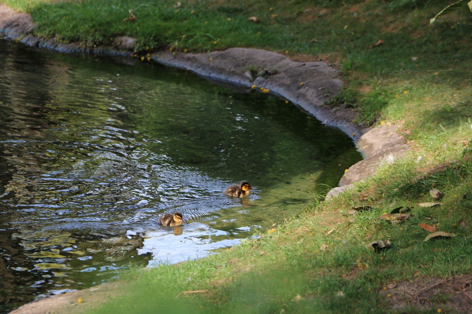 A couple of ducklings swimming in a pond on Discovery Island.