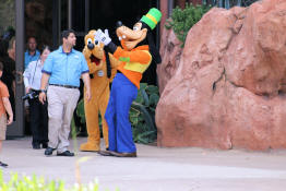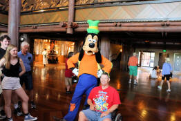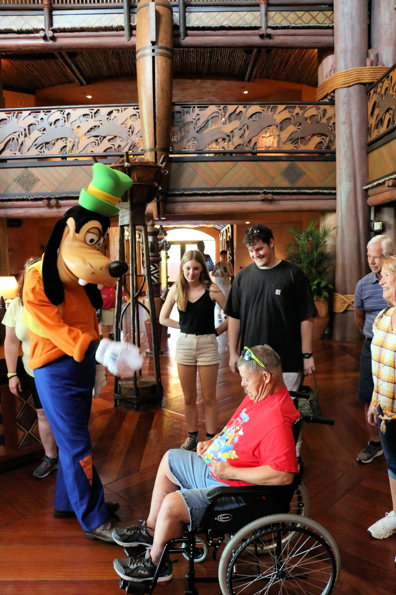Goofy is checking out Steven's shirt as Tara, Jayden, Drew, Grandpa