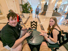 Drew and Jay sitting at a table in the Grand Floridian lobby.