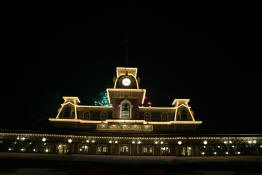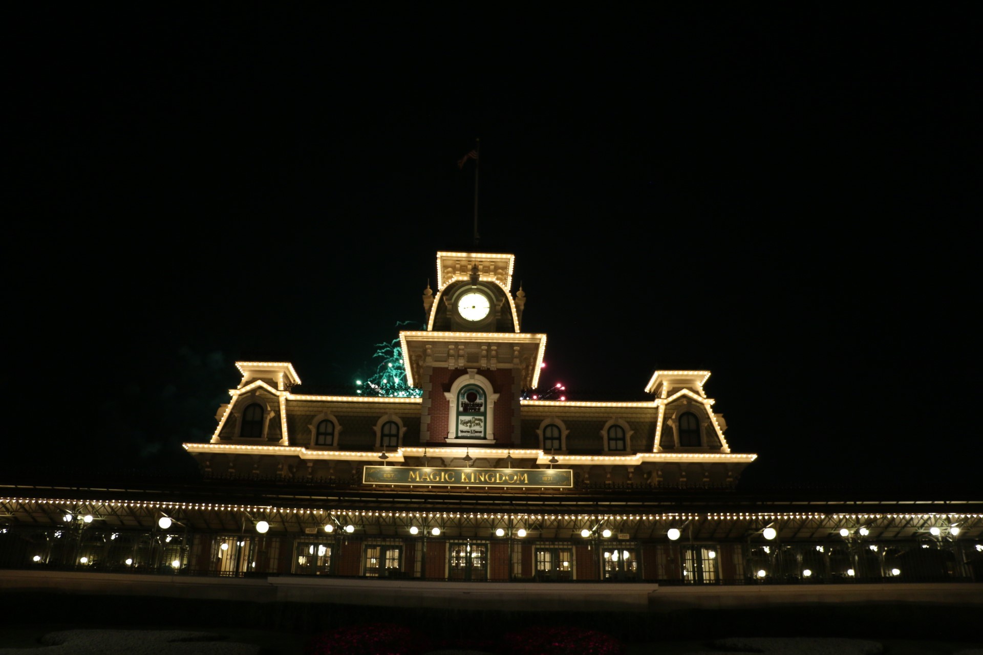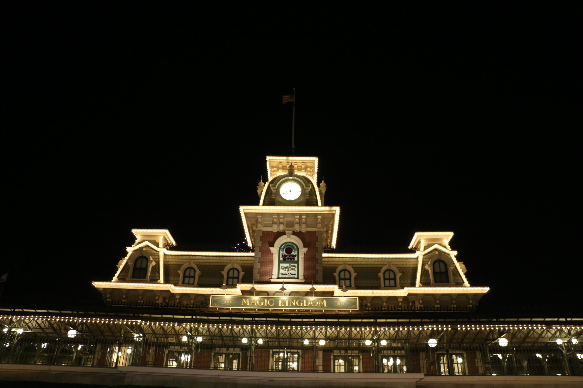A look at the Walt Disney World Railroad lit up at night before entering the