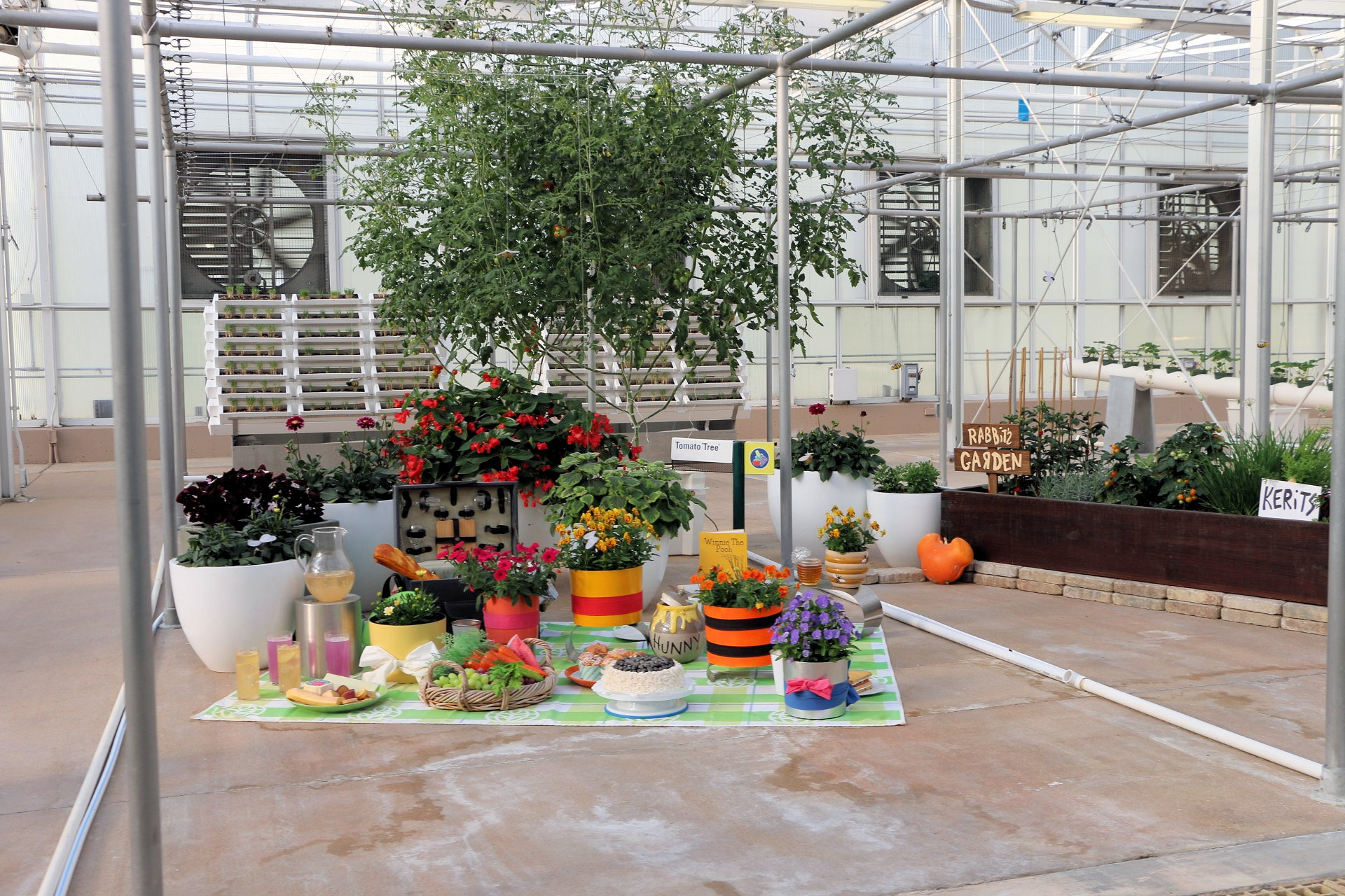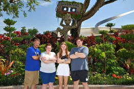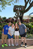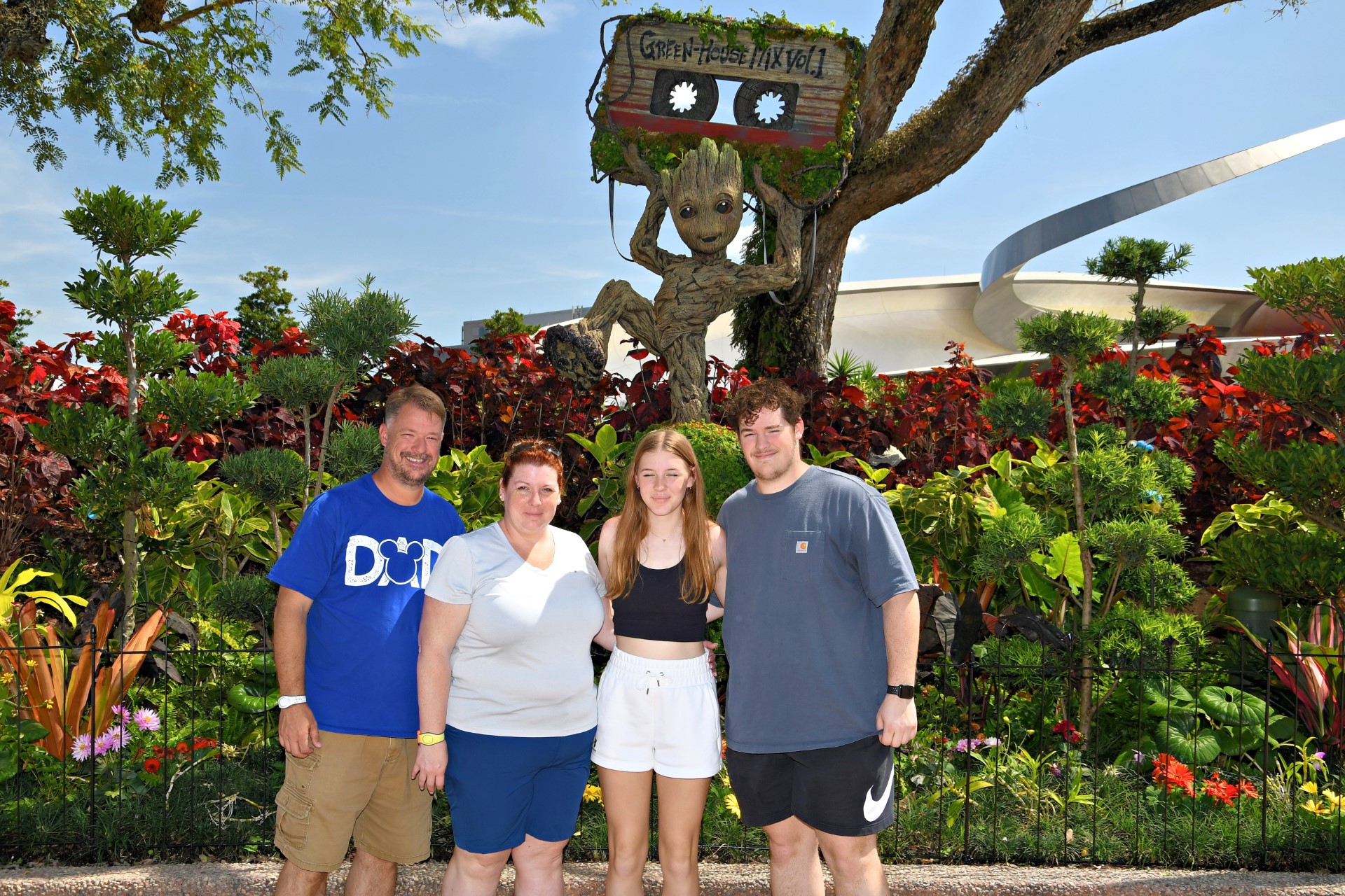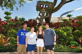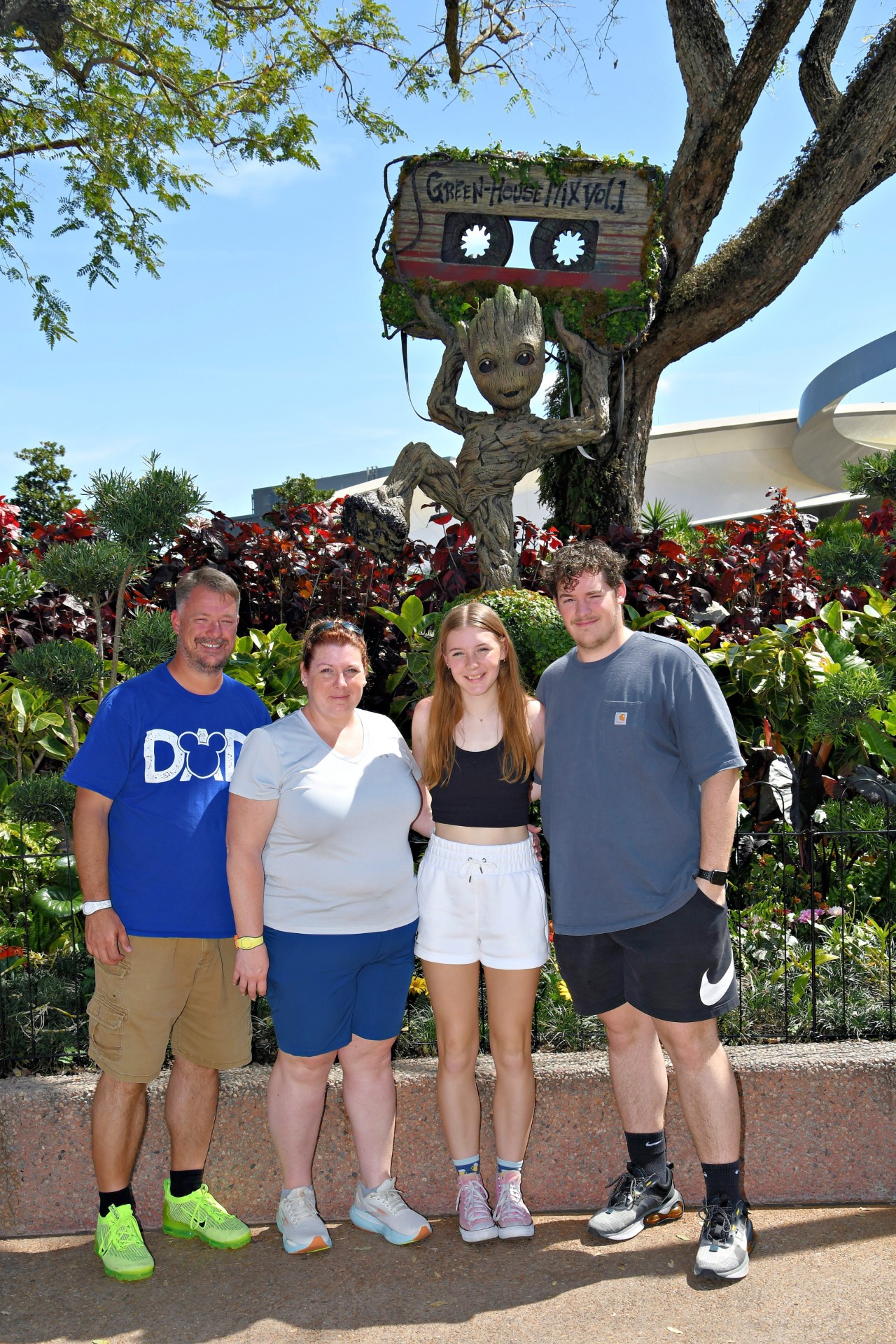 Rodney, Tara, Jayden, and Drew posing with the Groot topiary