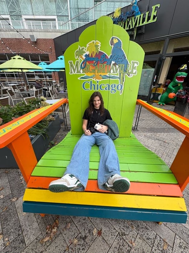 Hana on a giant chair at Jimmy Buffett's Margaritaville Bar & Grill.